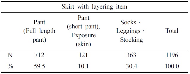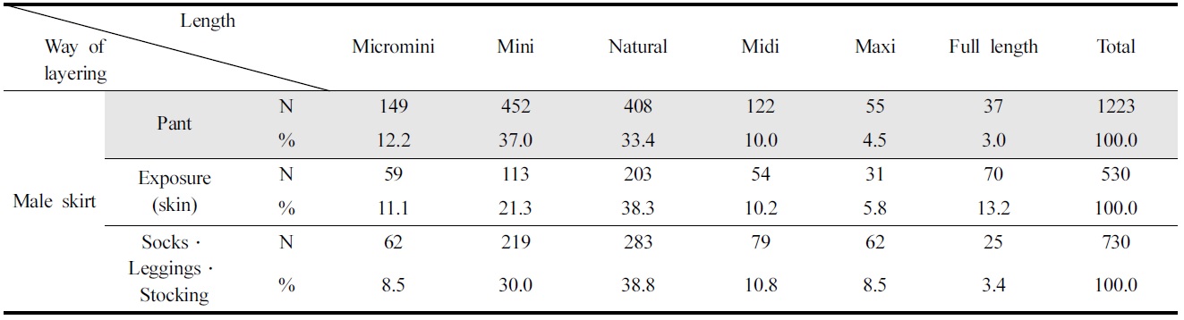 남성 스커트의 착장방식 중 가장 높은 49.4%의 비율을 차지한 팬츠와 레이어링한 데이터를 분류하여 다시 분석해보았더니 길이에서 차이가 나타나는 것을 알 수 있었다. 일반적으로 노출, 양말·스타킹·레깅스와 레이어링한 경우 내추럴 길이가 가장 높았으나 팬츠와 함께 레이어링되는 스커트의 경우 미니가 더 높은 특성이 있었다. 스커트의 길이 중 짧은 길이에 속하는 마이크로미니와 미니는 각각 12.2%, 37.0%로 팬츠와 함께 레이어링했을 경우 가장 활용도가 높았음을 알 수 있었다. 반면 길이가 가장 긴 풀 렝스(롱)는 다른 아이템과 혼용이 적은 편이고 스커트 하나만을 착용하는 경우가 많았다. 그중 13.2%로 다리를 노출하는 방식에서 가장 높은 빈도를 보였다(Table 3). 양말·스타킹·레깅스와 함께 레이어링할 경우 중간 길이의 스커트인 내추럴, 미디와 긴 길이의 맥시에서 높게 나타났다. 내추럴은 38.8%, 미디는 10.8%, 맥시는 8.5%의 비율로 양말·스타킹·레깅스와 레이어링에서 가장 높은 활용도를 보였다.