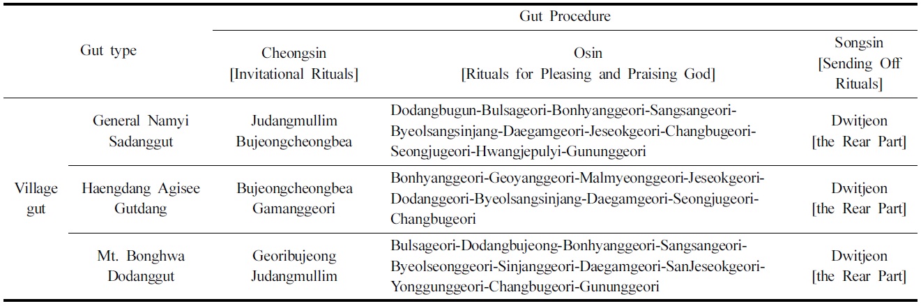 이와 같은 서울 마을굿은 연행하는 굿거리가 거의 일정하나당 해년의 상황에 따라 제차의 차이가 있다. 또한 보는 관점에 따라 굿거리 분류가 달라질 수 있으나 대체적으로 굿청을 정화하는 의식에서 출발하여 여러 신격들을 모셔서 공수를 받고, 신을 돌려보내는 절차로 마무리되는 기본구조인 청신(請神)-오신(娛神)–송신(送神)로 구성된다. 서울 마을굿에서는 신을 불러 주당 앞에 사람들을 물리고, 부정을 쫓아 청결하게 하여 신을 배알하는 부정청배, 제신들을 불러들여 청배하는 가망청배인 청신으로 굿이 시작되어 불사(제석), 본향, 말명, 상산, 별상, 신장, 대감, 창부, 성주, 군웅거리 등에서 제석신, 산신, 별상신, 잡신등을 모셔와 신을 즐겁게 하여 정성을 다하는 오신으로 본격적인 굿판을 벌리고, 마지막으로 뒷전을 통해 신을 보내는 송신으로 굿을 마무리한다. 따라서 용문동부군당 남이장군 사당굿, 행당동 아기씨당굿, 봉화산 도당굿을 제차별로 정리하면 Table 1과 같다.