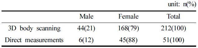 3D body scanning participants were total 212, representing the distribution of 44 male, 168 female. Direct measurements participants were total 51, 6 male, 45 female (Table 2).
