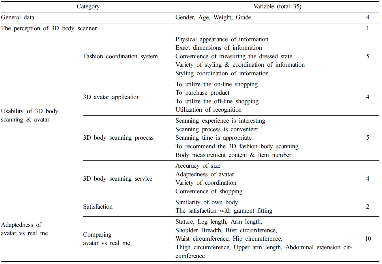 This research investigated college students to perform the 3D body scanner-based measurement, their avatar generation and virtual fitting. The research participants then were surveyed to collect their responses. This research survey was structured by appropriately modifying the preceding studies by Yoon (2011) and Pack (2006) for this research purposes. The survey has 35 items in total including 4 inquiry items on general information; 1 on the perception of 3D body scanner; 18 on usability of 3D body scanning & avatar; and 12 on the satisfaction of 3D body scanning experience & adaptedness of avatar vs real me. The 5-pointed likert scale was used (Table 3).