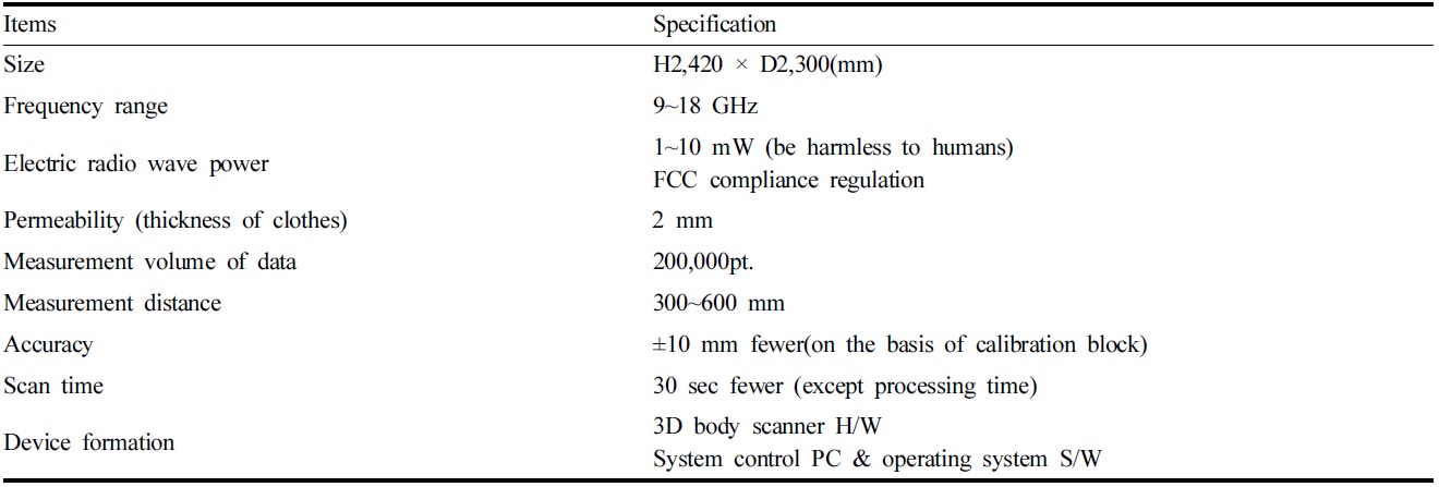 Key specifications of the human body measurement scanning system are in Table 4. Standard size of H2,420×D2,200 mm, frequency range 9~18 GHz, electric radio wave power 1~10 mW (harmless to human body), permeability (thickness of clothes) 2m, measurement volume of data 200,000pt, measurement distance 300~600m, scan time 30sec fewer (except processing time), accuracy ±10 mm fewer(on the basis of calibration block), and device formation 3D body scanner H/W system control PC & operating system S/W.