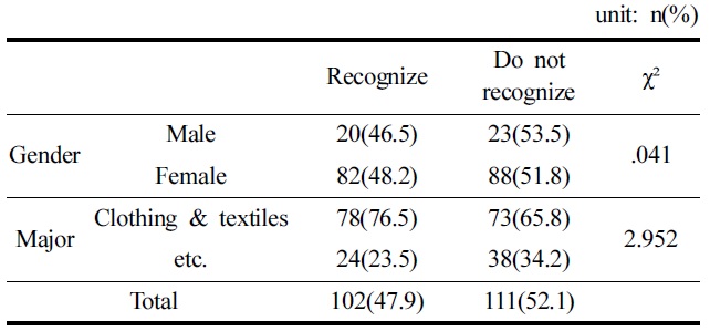 Firstly, about the question regarding the perception of 3D body scanner, the respondents reported ‘do not recognize’ with 52.1% (111 persons) of all participants, 53.5% (23 persons) of male students, 51.8% (88 persons) of female students. Therefore, the result indicated that more than half of the subjects do not know it, the survey did not show significant difference according to gender. And the significant difference didn’t appear about awareness according to the major (Table 5).