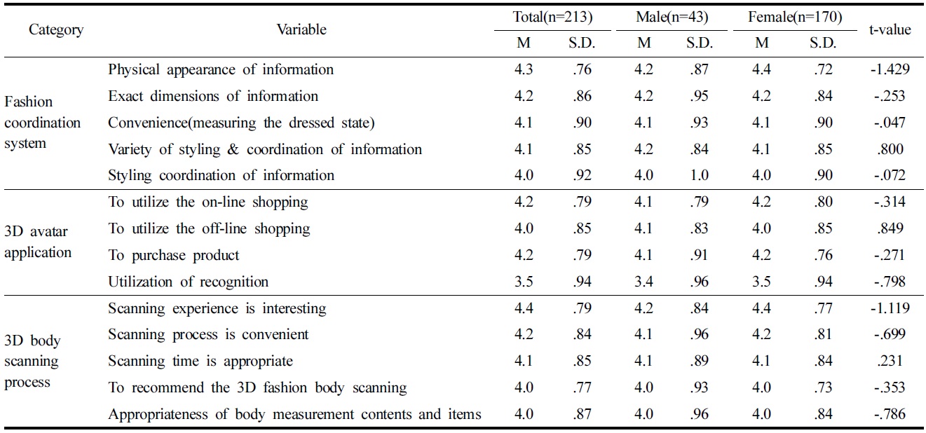 Next, a questionnaire survey was conducted with a 5-point likert-type scale ranging 1 (strongly disagree) to 5 (strongly agree) concerning ‘3D body scanning & fashion avatar experience’ in Table 6. The result of the survey did not show significant difference according to gender, that is, both male and female all showed a positive attitude about it.