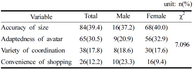 After generating an individual avatar by applying the 3D body scanning data, questions were asked on the necessary services for styling and coordination. As a result, 39.4% of them said they needed the ‘Accuracy of size’ the most, followed by ‘Adaptedness of avatar’ 30.5%, ‘Variety of coordination’ 17.8% and ‘Convenience of shopping’ 12.2%. A chi-square analysis was done according to genders but no significance difference was found between male and female (Table 7).