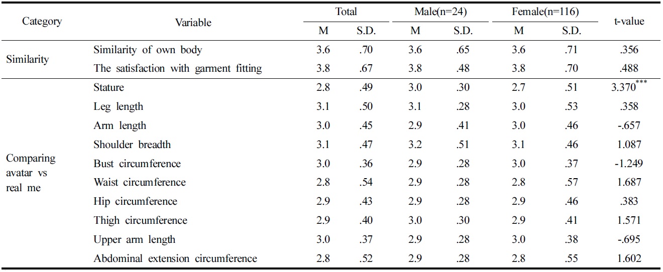 The sizes of 3D avatar shape and real me were compared for accuracy by separating male and female. As a result, no significant difference was found in all items excluding stature. ‘leg length’ and ‘shoulder breadth’ item were found to be 3.1, meaning smaller measurement than real me. The ‘arm length’ and ‘bust circumference’ were 3.0, signaling appropriateness in fitting. Other items including ‘waist circumference’ and ‘abdominal extension circumference’ 2.8, ‘hip circumference’, and ‘thigh circumference’ were 2.9, which means larger measurements than real me. Male and female showed a significant difference in ‘stature’ item. Male said the fitting was okay and female said the fitting was larger than themselves.