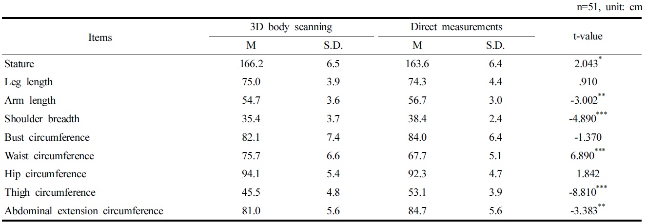 Next, the t-test results of the 3D scan data and direct measurements showed significant differences in 6 items (stature, arm length, shoulder breadth, waist circumference, thigh circumference, abdominal extension circumference) out of the total of 9. As for the 3D body scanning that measured body sizes while wearing a cloth, more research is necessary for the accuracy of sizes. And the avatars produced based on such data, too, may be less similar to the own bodies, possibly causing customer dissatisfaction.