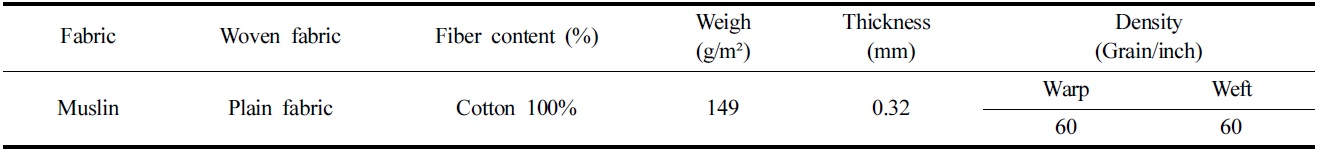 개발된 마스터 패턴의 참고원형을 선정하기 위해, 30~39세 여성 다빈도 구간에 해당하는 피험자 치수(젖가슴둘레 91 cm, 키 160 cm)를 사용하여 A식, B식, C식, D식의 4종류의 토르소 원형실험복을 제작하였으며 표준체형 바디에 착의시키고 외관 관능검사를 통해 형태 적합성을 평가하였다. 실험복의 소재로 사용된 머슬린의 물리적 특성은 Table 1과 같다.