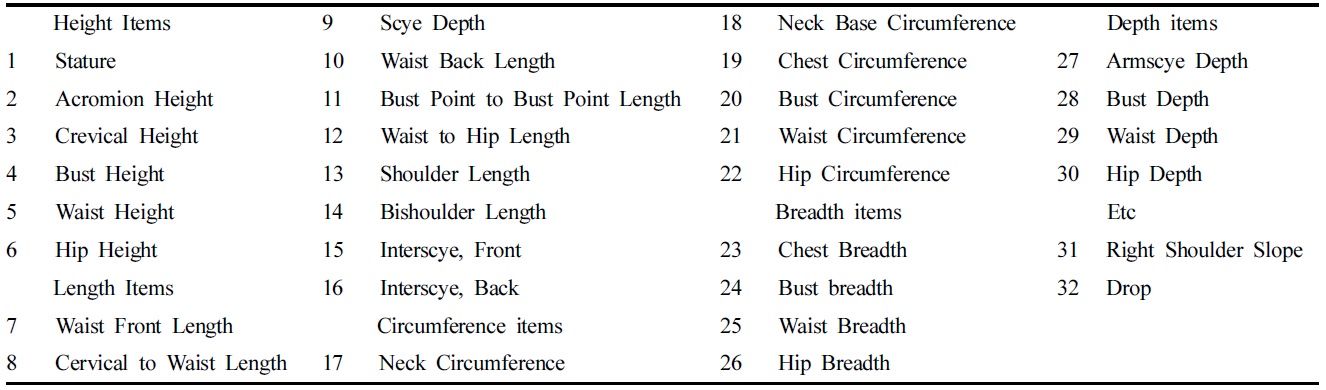 - Choi, Y. K., Shape classification of body type on adult female and its variation of size and shape according to their age, Seoul National University, Seoul, (1997), Unpublished doctoral dissertation.