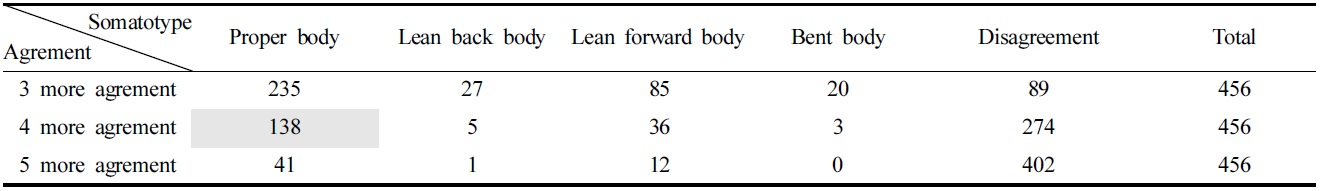 3차원 측면 인체형상 분석을 위해 형상데이터에 기준선을 표시하여 의복구성 관련 전문가 5인의 집단을 대상으로 설문을 실시하였다. 전문가 집단의 측면체형 분류결과 일치도는 다음과 같다(Table 3). 전체 일치도는 85.93%로 나타났으며, 체형특성을 면밀하게 살펴보기 위해 전문가 집단의 일치도가 4명 이상인 분류를 사용하여 피험자 138명을 이용하여 형상특징을 분석하였다.