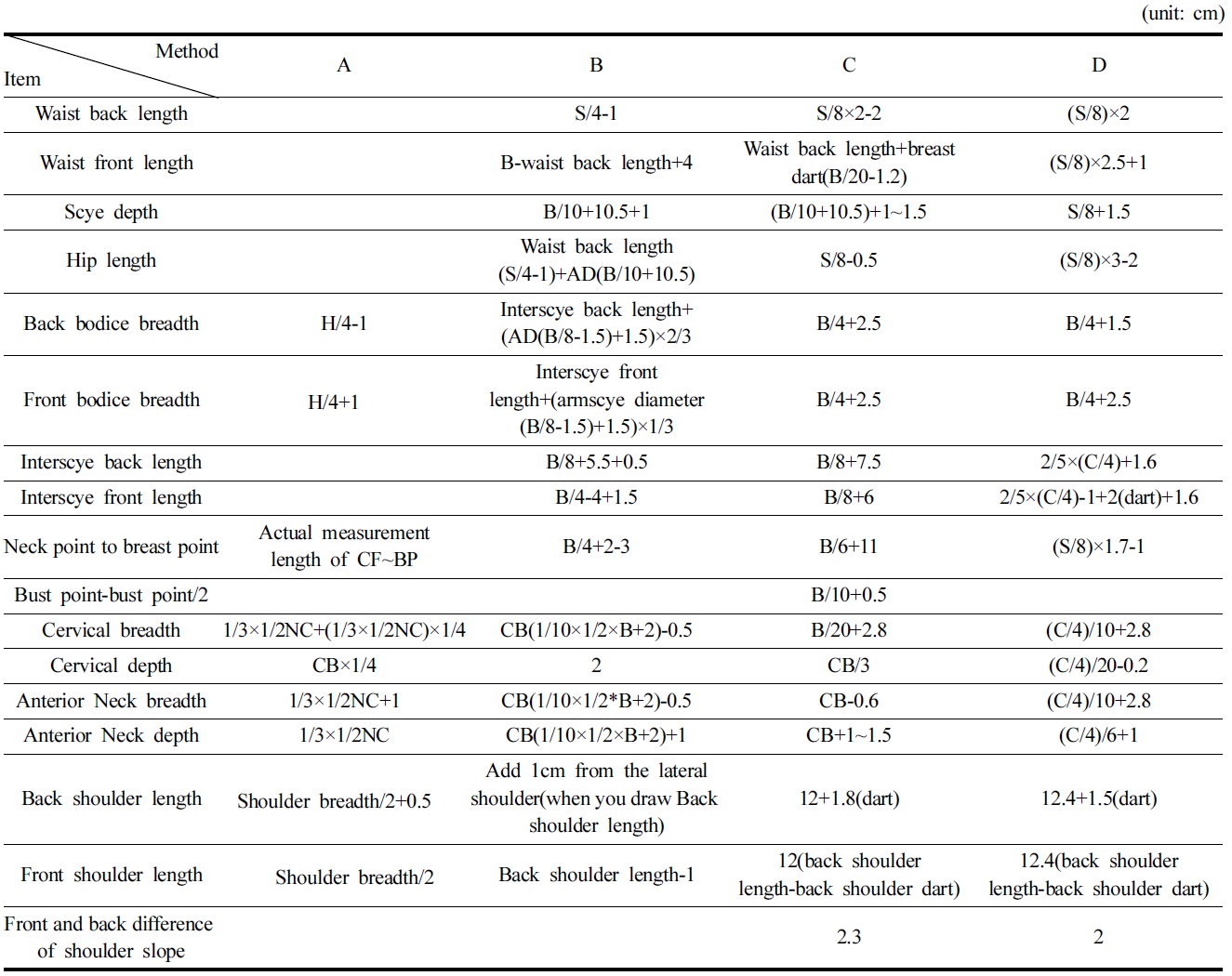 A식의 경우 허리둘레 치수를 따로 사용하지 않는다는 차이점을 보였으며, 다른 제도법은 계산공식을 사용하여 목옆젖꼭지점 길이를 도출하는 반면, A식은 앞중심점에서 젖꼭지점까지의 길이를 실측하여 사용하였다. 기준선 설정 방법에는 A~D식 제도법 모두 가슴둘레 치수를 공통으로 사용하였다. 하지만 A식은 가슴둘레 치수를 나누어 배분하는 방식이 아닌 엉덩이 둘레 치수를 나누어 앞판을 1 cm 더 크게 하였으며 B식 역시 앞판과 뒤판 기준선 설정에 차이를 두었으나 뒤판을 더 크게 하였다. C식은 앞뒤를 동일하게 설정하였으며 D식은 앞가슴둘레를 뒷가슴둘레에 비하여 1 cm더 크게 두어 B식과 결과적으로 동일하게 설정하였다. 이는 여성의 가슴 부분에 의한 앞뒤 두께 차이를 고려하여 기준선 설정에 반영해야함을 나타내었다. 여유량 설정 방식에서도 A~D식 제도법은 차이를 보였다. A식은 앞판에 2 cm, 뒤판에는 1cm를 주었다. B식은 뒤품에 0.5 cm, 앞품에 1.5 cm의 여유량을 주었으며, C식은 앞품과 뒤품에 각각 2.5 cm 여유량을 주었다. D식은 뒤판에 1.5 cm 앞판에, 2.5 cm로 총 4 cm의 여유량을 주었으나, 뒷중심선에서 봉제시 깎아 없어지는 분량을 생각하면 총 3 cm의 여유량을 설정한 것이다(Choi et al., 2007). 앞과 뒤의 여유분량을 다르게 설정할 때에는 앞을 더 많이 주었으며 앞과 뒤의 여유량을 동일하게 설정하기도 하였다. 기준선 설정에 사용되는 등길이 항목은 B식, C식, D식 모두 키를 사용한 계산공식을 사용하였으나 A식은 실측치를 사용한다는 점에서 차이를 보였다. 진동깊이선 설정에서 B식과 C식은 가슴둘레 관련 공식에 여유분을 추가하는 방식이었으며, D식은 키와 관련된 공식을 사용하였다. A식은 일반적으로 사용하지 않는 앞중심 길이와 뒷중심 길이를 직접 사용하여 진동깊이선으로 설정하였다. 뒷목너비의 경우 A식 제도법은 목둘레 공식을 사용하였으며 B식은 뒷목너비와 가슴둘레를 사용한 공식을 사용하였다. C식과 D식은 가슴둘레 치수 공식을 사용하였으나 C식은 젖가슴둘레, D식은 가슴 둘레치수를 사용한 차이를 보였다. 뒷목깊이 공식에서는 A, C식은 뒷목너비 치수를 사용하였으며 B식은 고정치수 2 cm를 적용하였다. D식은 뒷목너비에서와 같이 뒤목깊이 역시 가슴둘레치수를 이용한 공식을 사용하였다. 앞목너비와 앞목깊이 설정시 A식은 뒷목너비를 사용한 공식을 B식은 뒤목너비와 가슴둘레를 사용한 공식을 사용하였으며 C식은 뒷목너비를 사용한 공식, D식은 가슴둘레를 사용한 공식을 이용하였다. 목둘레의 설정시 제도식마다 사용하는 공식과 사용되는 치수가 달랐으나 상의 원형제도식에 가슴둘레를 기본 치수로 사용하는 경우가 가장 많았다. 앞뒤 어깨처짐 분량은 A식은 없었으며, B식은 뒤 어깨처짐 1.5 cm를, C식은 뒤 어깨처짐에 뒷목너비/3의 수치를 사용하여 앞 어깨처짐 분량에는 뒷목너비의 2/3의 치수를 사용하여 2.3 cm 차이가 나도록 하였으며 앞판이 뒤판의 2배로 적용하였다. D식 역시 뒤 어깨처짐은 4.7 cm, 앞 어깨처짐은 6.7 cm로 앞판이 2 cm 더 처지도록 설정하였다. D식은 다른 치수 설정과 마찬가지로 길이와 관련된 항목에는 키를 사용한 계산공식을 사용했다는 점에서 차이를 보였다.