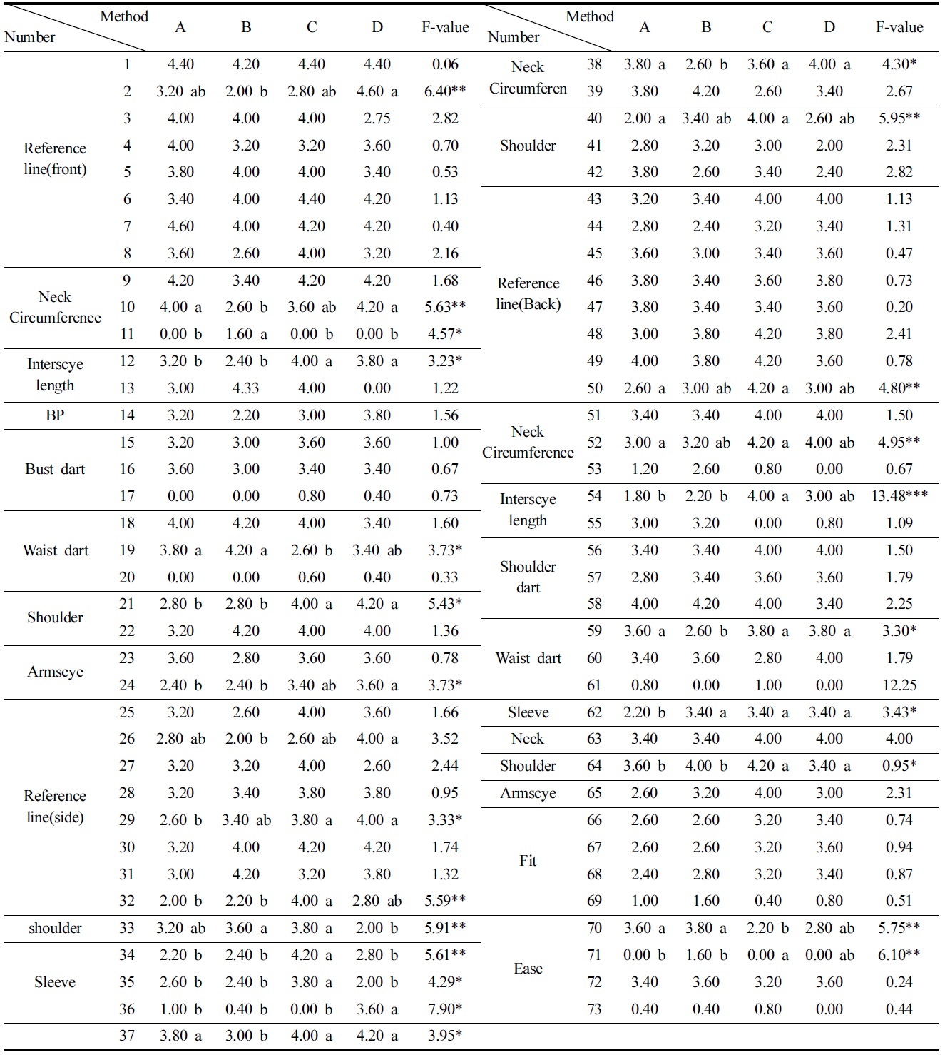 분석에 사용된 토르소 제도법을 사용하여 제작된 토르소 원형의 관능검사에 사용된 응답의 내적 일관성을 검토하기 위해 산출된 신뢰도 계수인 크론바하의 알파(Chronbach’s α)값은 0.8이상이면 만족스러운 것으로 평가되고, 0.7 이상을 채택하기도 한다(Lee & Jung, 2010). A식은 신뢰도 계수 0.89, Mϋller식은 신뢰도 계수 0.89, C식은 0.94, D식은 0.93으로 나타나 관능검사 결과는 객관적으로 신뢰할 수 있다고 결론내릴 수 있다. 전문가 5인의 관능검사 결과는 다음과 같다(Table 5).