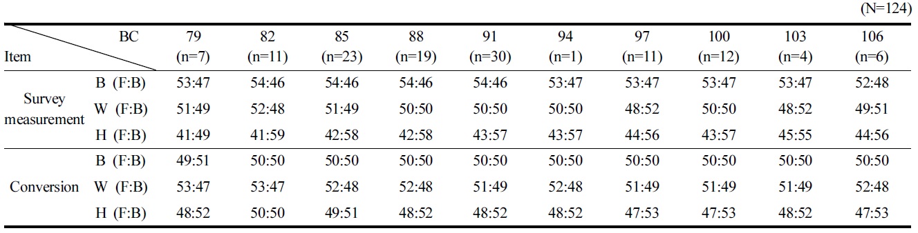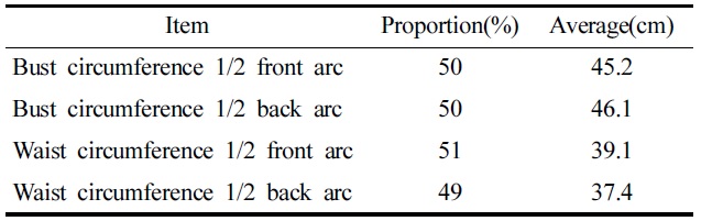 젖가슴둘레 91 cm를 기준으로 젖가슴둘레 수준의 1/2 앞 호, 뒤 호의 차이 값의 평균값과 허리둘레 수준의 앞 호, 뒤 호 차이의 평균값을 살펴보면 다음과 같다. 젖가슴둘레 50:50일 때 허리둘레는 앞 호와 뒤 호의 비율이 51:49로서 앞 호가 뒤 호에 비하여 조금 더 큰 것을 알 수 있다. 실제 평균값의 차이는 1.7 cm로서 이를 앞뒤에 나누어 배분하면 0.8 cm를 더해주고 뒤쪽에 0.8 cm를 빼주면 앞뒤 두께차이를 반영할 수 있다 (Table 7).