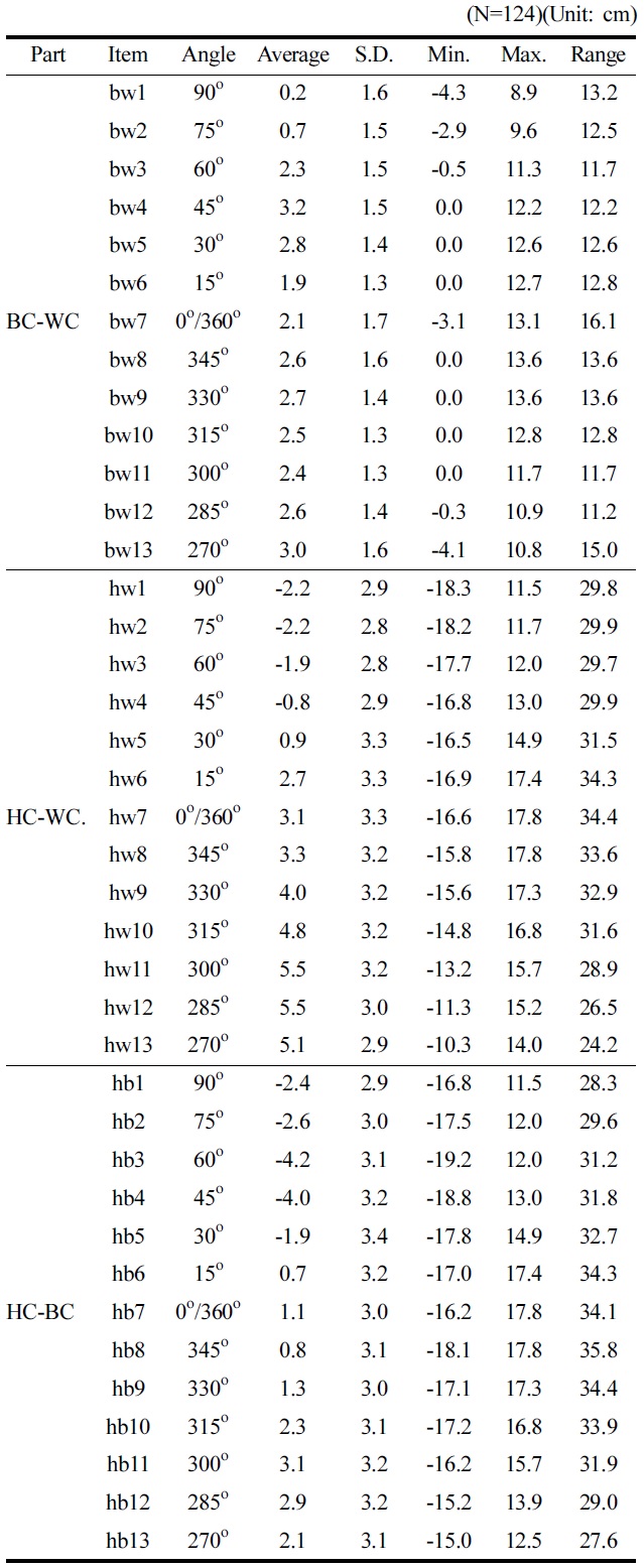 단면 공극거리의 기술 통계 값은 Table 7과 같다. 인체 단면의 각도별로 측정된 공극거리는 한 단면당 15° 각도로 13개 항목이 측정되었다. 1부터 13까지 각도 중에서 1은 앞중심에 해당하며, 7은 옆선, 13은 뒷중심에 해당하는 값이다(Table 8).