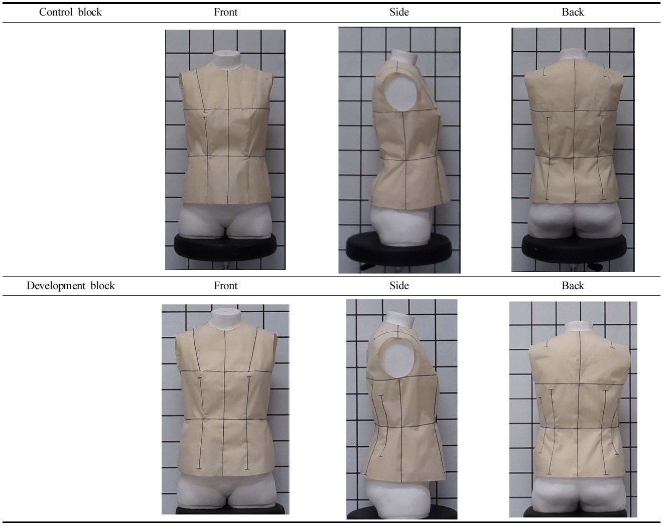 비교원형으로 선정된 토르소 패턴의 제도법을 참고하여 전문가 외관평가 결과를 통해 보완 및 개선해야 할 부분을 도출하고, 30대 여성의 인체측정치 및 3차원 측정치를 반영한 마스터 패턴을 개발하여 착의실험을 실시하였다. 30대 여성의 다빈도 구간에 해당하는 젖가슴둘레 91 cm, 키 160 cm 구간의 재현바디를 제작하여 마스터 패턴의 어깨부위 제도법 설정에 재현바디의 어깨각도를 활용하였으며 해당 재현바디에 착장시킨 후 외관평가를 실시하도록 하였다. 상반신 토르소 바디를 제작하기 위해 팔 부분과 허벅지 이하의 불필요한 부위를 제거하였으며, 인체의 좌우가 대칭을 이루도록 정중면을 기준면으로 지정하여 Mirror 과정을 거쳤다. 재현바디는 스티로폼으로 제작되었으며 바디제작에는 스티로폼 몰딩기계인 EPS(Expandable Polystyrene)조작기가 사용되었으며 형상수정에는 Rapidform 2006(INUS Technology, Inc, Korea)이 사용되었다. 평가 및 검증에는 비교원형의 도출과정과 동일하게 전문가 5인의 외관 관능검사를 실시하였다.