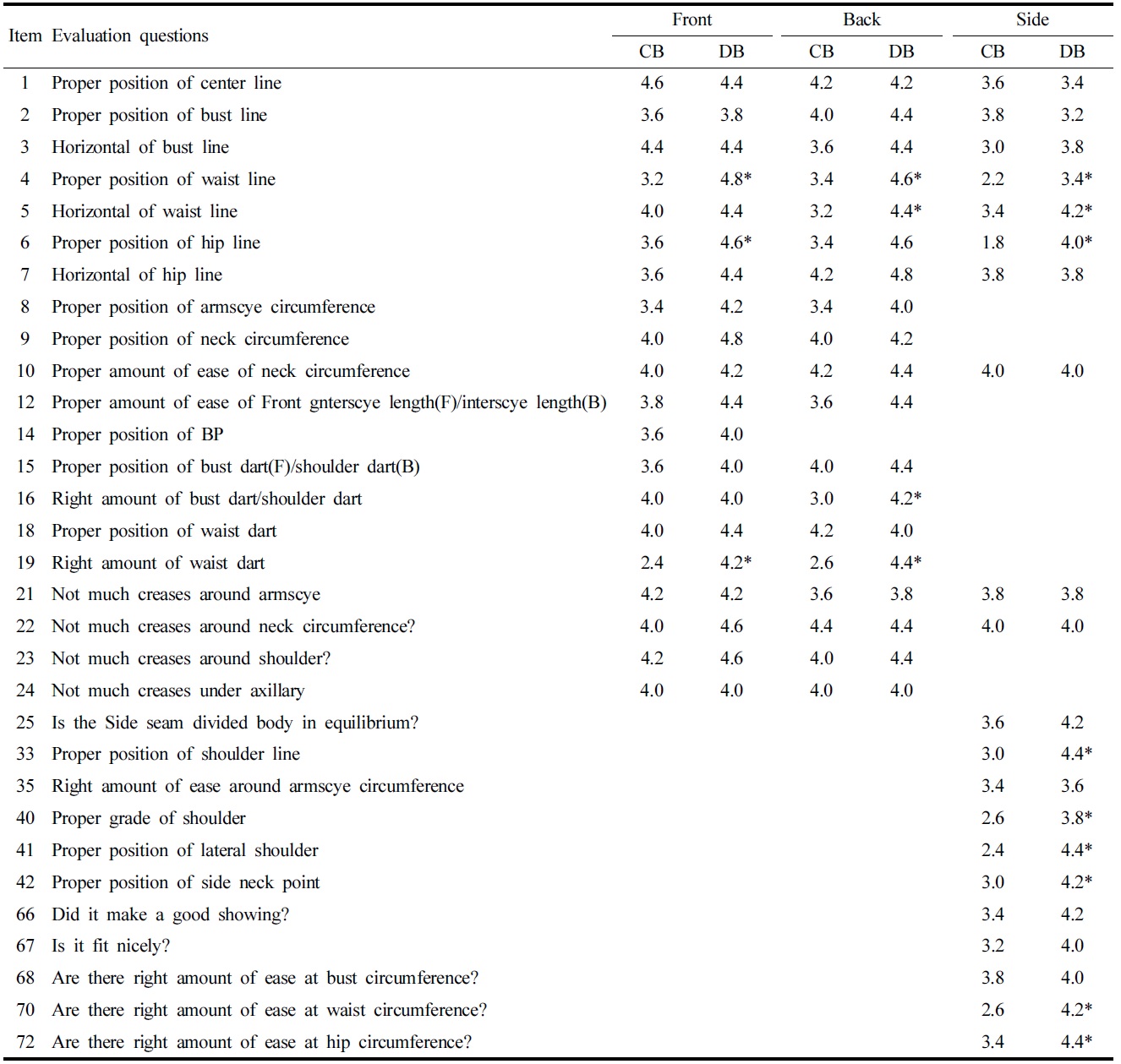 연구 집단의 다빈도 구간에 해당하는 젖가슴둘레 91 cm, 키160 cm으로 제작된 비교원형과, 비교원형의 문제점을 개선하고 인체측정치를 반영하여 개발된 연구원형의 전문가 외관 평가결과는 다음과 같다(Table 10). 외관평가 항목 중, 연구원형과 비교원형의 t-test결과 표준오차가 ‘0’인 경우 t-값 계산이 불가하였다. 연구원형과 비교원형을 평가결과 1점 이상 차이가 나는 항목에 대해 ‘*’로 표시하였다. 앞면 기준선에서는 엉덩이 둘레선의 위치 적합성 여부를 묻는 질문에서 연구원형이 비교원형에 비해 더 높은 점수를 받아 개선된 것을 알 수 있다. 앞허리 다트의 양은 달라지지 않았지만 옆선 설정에 있어서 앞품의 여유분량이 부족하다는 전문가 외관평가 결과를 반영하여 0.5 cm 늘려준 결과, 앞품의 연장선에서 생성되는 허리선이 영향을 받아 허리 다트의 양은 동일하지만 허리 부분의 외관에서 개선된 결과를 보인 것으로 생각된다. 앞처짐 분량에 대한 3회의 예비실험을 통해, 앞이 들리지 않는 치수인 1.5 cm를 반영해준 결과, 비교원형에서 매우 낮은 점수를 얻었던 엉덩이 둘레선 수평여부에서 연구원형이 수평을 이루며 개선된 결과를 보였다.