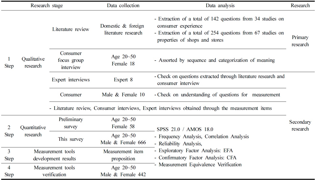 본 연구에서는 정성적 연구단계(1차 연구)의 결과를 적용시키기에 무리함이 없는 타당성을 지녔는가를 평가받기 위해 전문가 면접을 시행하였다. 전문가 면접을 통해서 점검된 설문문항들의 정확한 의미전달을 위해 표현이 부자연스럽거나 이해가 어려운 문항들을 가려내기 위하여 남·여 소비자 10명을 대상으로 측정문항을 체크하도록 하였다. 이후 정량적 연구단계(2차 연구: 2~4단계)의 분석을 위하여 SPSS 21.0과 AMOS 18.0 통계프로그램을 이용하였다. 2단계 정량적 연구에서는 예비조사와 본 조사를 통해서 20~50대 사이의 남녀 응답자 666명을 대상으로 수집된 설문지는 빈도분석, 신뢰도분석, 상관관계분석, 탐색적 요인분석, 확인적 요인분석을 실시하였다. 3단계에서는 개발된 측정도구인 측정문항을 제안하였으며, 4단계에서 측정도구 검증을 위해 단일차원성, 구성개념 타당성, 측정동일성 검증을 실시하였다. 다음의 Table 1은 연구단계별 자료수집 및 자료 분석방법을 제시한 것이다.
