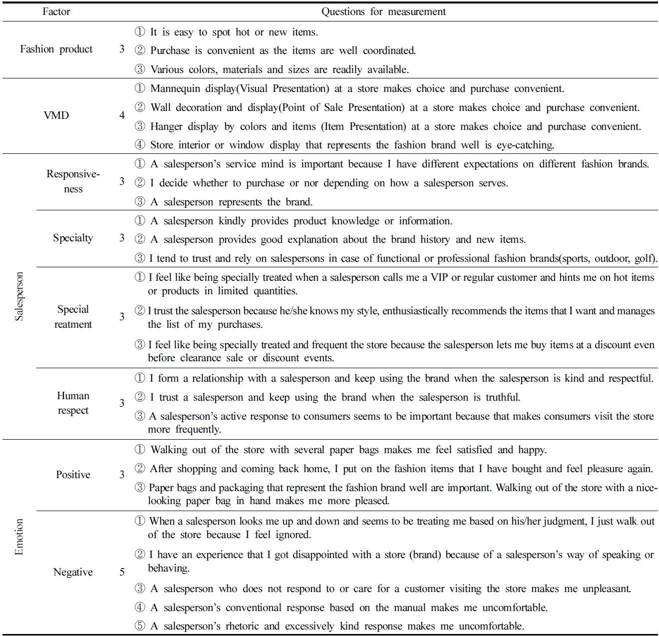 예비조사 결과, 패션브랜드 매장내부에서의 브랜드 체험에서 패션상품 체험 2개 문항, VMD 체험 4개 문항, 판매원 응대성 체험 8개 문항, 판매원 정보성 체험 3개 문항, 판매원 특별대우 체험 1개 문항, 판매원 인간적 존중 체험 1개 문항, 긍정적 감정체험 4개 문항, 부정적 감정체험 2개 문항, 총 25개 문항이 제거되었다. 패션상품 체험 4개 문항, VMD 체험 7개 문항, 판매원 서비스에서는 판매원 응대성 체험 7개 문항, 판매원 정보성 체험 4개 문항, 판매원 특별대우 체험 4개 문항, 판매원 인간적 존중 체험 3개 문항으로 분류되었으며, 긍정적 감정체험 5개 문항, 부정적 감정체험 7개 문항으로 총 41개의 측정문항이 도출되었다. 패션브랜드 매장내부에서의 브랜드 체험에서 감정체험이 긍정적 감정체험과 부정적 감정체험으로 분류되어 8개 체험요인으로 세분화되었다.