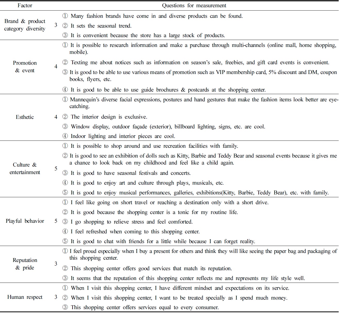 패션브랜드 매장외부에서의 브랜드 체험 측정문항은 브랜드및 상품군 다양성 체험 2개 문항, 편의 및 부대시설 체험 7개 문항, 물리적 환경시설 체험 5개 문항, 정책서비스 체험 2개 문항, 심미성 체험 1개 문항, 문화·엔터테인먼트 체험 2개 문항, 유희적 행동 체험 3개 문항, 교육 및 정보성 체험 3개 문항, 명성 및 자부심 1개 문항, 총 26개 문항이 제거되었다. 패션브랜드 매장외부에서의 브랜드 체험요인은 물리적 환경시설 체험과 정책서비스 체험요인이 제거되어 11개 체험요인에서 9개 체험요인으로 축소되었다. 패션브랜드 매장외부에서의 소비자 체험 측정문항은 브랜드 및 상품군의 다양성 체험 4개 문항, 편의 및 부대시설 체험 5개 문항, 판촉·이벤트 체험 4개 문항, 심미성 체험 4개 문항, 문화·엔터테인먼트 체험 8개 문항, 유희적 행동 체험 8개 문항, 교육 및 정보성 체험 3개 문항, 명성 및 자부심 체험 3개 문항, 인간적 존중 체험 3개 문항으로 총 42개의 측정문항이 도출되었다. 물리적 환경시설 체험 5개 문항과 정책서비스 체험 2개 문항은 삭제되었다. 이러한 이유는 소비자들은 대형화 되어가는 쇼핑센터의 물리적 환경시설이나 정책서비스는 대형 쇼핑센터가 기본적으로 갖추어야 할 물리적 환경시설이나 서비스라 생각하는 것으로 여겨진다.