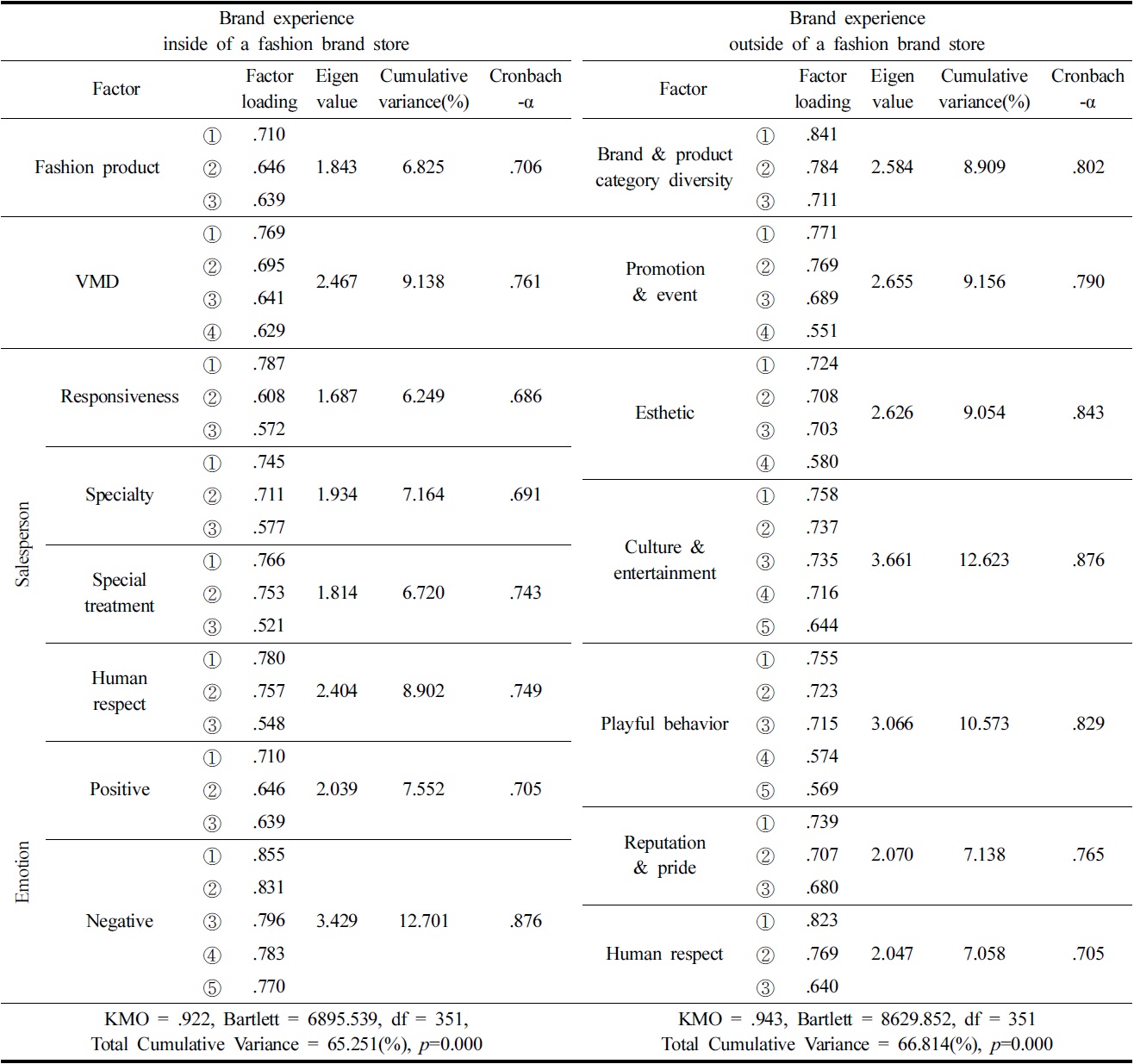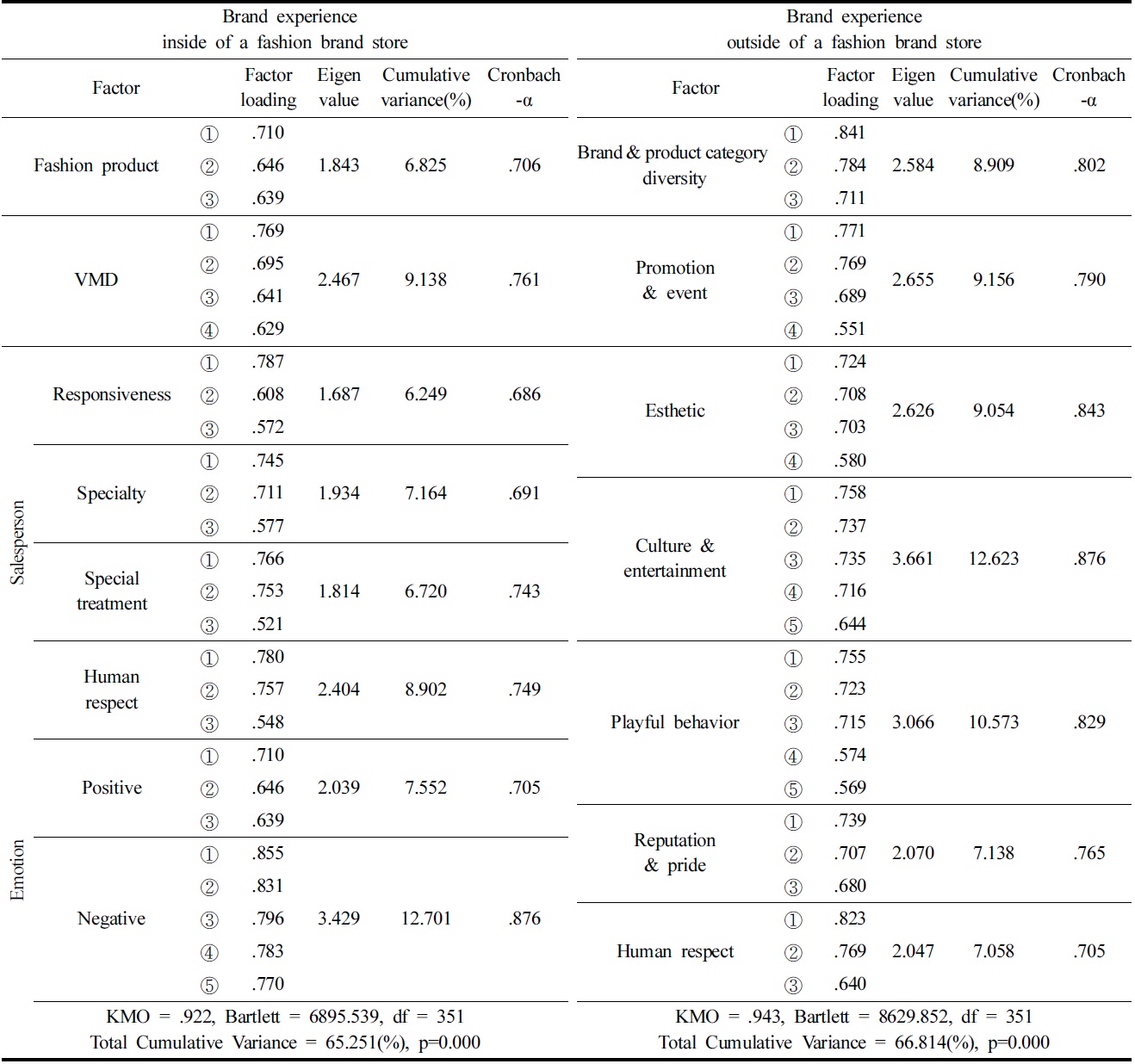 패션브랜드 매장내부에서의 브랜드 체험요인 분석결과, 8개 요인에 의해 총 분산의 65.251%가 설명되고 있으며, 패션브랜드 매장내부에서의 브랜드 체험요인 중에서 판매원 서비스 체험요인의 합이 29.035%로 가장 중요한 설명변량을 나타내어 중요한 요인임을 확인하였다. 그리고 패션브랜드 매장외부에서의 브랜드 체험요인 분석결과, 7개 요인에 의해 총 분산의 66.814%가 설명되고 있으며, 패션브랜드 매장외부에서의 브랜드 체험요인 중에서 문화·엔터테인먼트 체험이 가장 높은 설명변량을 나타내어 중요한 요인임을 확인하였고, 다음 순으로 유희적 행동 체험이 중요한 요인으로 나타났다. 신뢰도는 모두 .07 이상으로 내적일관성이 확보되었다. 다음의 Table 4는 패션브랜드 매장 내·외부에서의 브랜드 체험에 대한 탐색적 요인 분석결과이다.