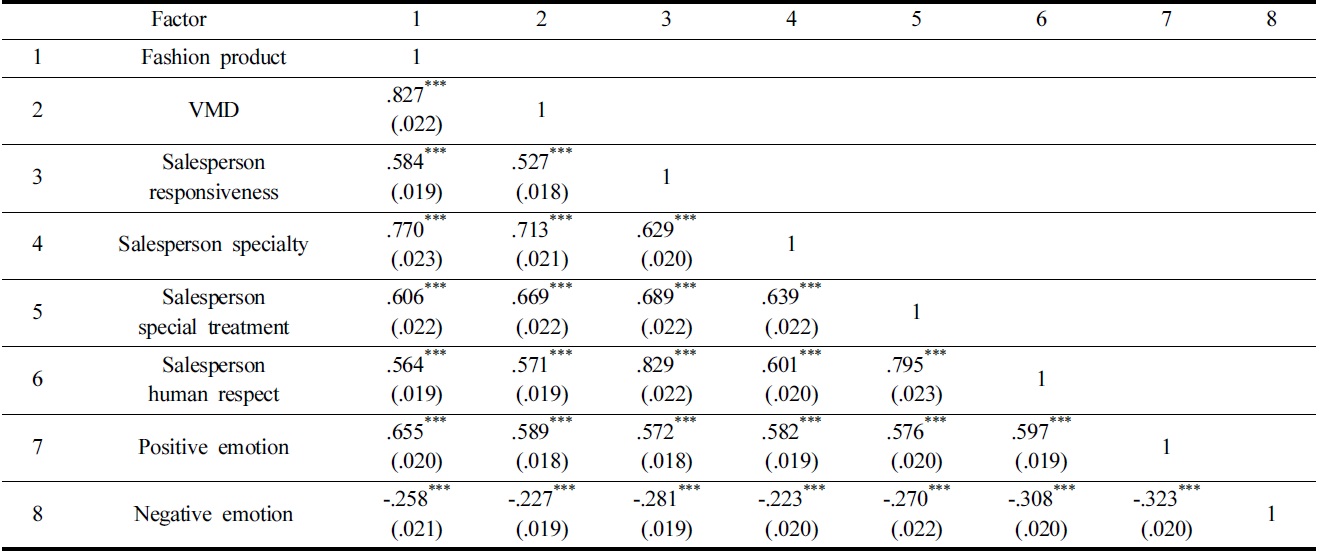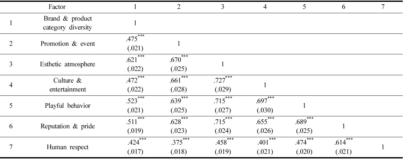 패션브랜드 매장 내·외부에서의 브랜드 체험에 대한 각 요인의 상관행렬을 구성한 후 요인 간 상관계수와 판별타당성을 확인하였다. 패션브랜드 매장 내부에서의 브랜드 체험요인에서 잠재변수들 중 상관이 높은 패션상품 체험과 VMD 체험 요인간 상관계수는 .827이고, 두 잠재변수 간의 표준오차는 .022임을 알 수 있다. 이 수치를 상관계수의 신뢰구간[Φ±2×S.E.]식에 대입하면, [.827±2×.022=.78~.87]으로 1을 포함하지 않고 있기 때문에 판별타당성이 있는 것으로 나타났다. 그리고 패션브랜드 매장 외부에서의 브랜드 체험요인에서 잠재변수들 중상관이 높은 심미성 체험과 문화·엔터테인먼트 체험요인 간상관계수는 .727이고, 두 잠재변수 간의 표준오차는 .029임을 알 수 있다. 이 수치를 상관계수의 신뢰구간 [Φ±2×S.E.]식에 대입하면, [.727±2×.029=.67~.79]으로 1을 포함하지 않고 있기때문에 판별타당성이 있는 것으로 나타났다. 다음의 Table 6과 Table 7은 패션브랜드 매장 내·외부에서의 브랜드 체험에 대한 구성요인 간 상관관계 분석결과이다.