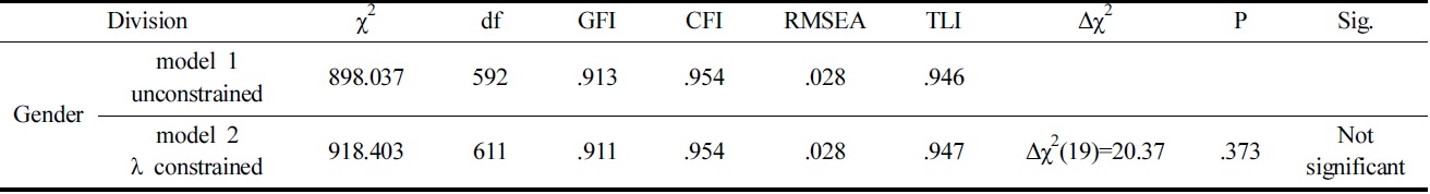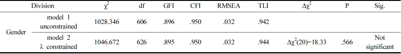 교차타당성은 모집단으로부터 추출한 표본에서 얻은 결과가 같은 모집단으로부터 추출한 다른 표본에서 얻은 결과와 통일한지를 검증할 때 이용되며(Myers et al., 2000), 이를 검증하기 위해서는 측정동일성에 대한 분석이 필요하다. 측정동일성은 집단 간에 측정문항에 대하여 제대로 이해하고 있는지 파악하기 위하여 검증하는 것으로서 집단 간에 동일한 결과를 보이는지 아닌지를 판단하여 사전에 측정동일성 조건을 만족한 후 다중집단분석을 통해서 검증한다(Wu, 2012). 따라서 본 연구에서 측정동일성을 검증한 이유는 20~50대 여성소비자들만을 대상으로 진행하였기 때문에 개발된 측정문항들에 대해서 제대로 이해하고 있는지를 파악하기 위해 패션브랜드 매장 내·외부에서의 브랜드 체험에 대한 남·녀 집단 간의 측정동일성을 검증하였다. 여기에서 model 1(형태동일성)은 집단 간에 어떠한 제약도 하지 않은 것으로 관측변수가 동일한 잠재변수에 적재되는지를 알아보는 것이고, model 2(요인부하량 동일성)는 집단별로 요인부하량을 동일하게 제약하여 동일하게 적제되는지 알아보는 것으로, 이 두 모델을 비교하였을 때 Δχ2의 값이 χ2의 값보다 작아야 하며 통계적으로 유의하지 않아야 측정동일성을 만족할 수 있다.