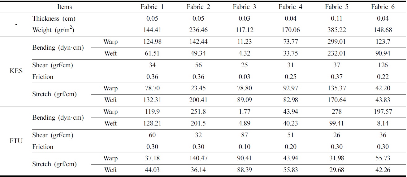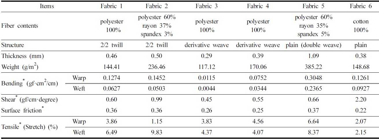 스커트는 소재에 따라 실루엣의 변화가 심하고, 그 중 플레어스커트는 소재의 역학적 특성에 따라 외관의 입체형상과 드레이프 형상이 좌우된다(Ki, 2013). 이에 소재물성이 완성된 의류제품의 외관에 큰 영향을 미치는 기본형 플레어스커트를 본 연구의 실험 아이템으로 선정하였다. 실험 소재는 시판되는 기본형 플레어스커트에 가장 보편적으로 사용되고 있는 폴리에스터 100%, 폴리에스터-폴리우레탄 혼방, 폴리에스터-레이온-폴리우레탄 혼방 직물 중에서 두께와 중량, 드레이프 특성이 상이한 다섯 가지를 선정하고, 여기에 연구용 소재로 많이 사용되는 20수 광목을 추가하여 총 6가지 직물을 실험 대상으로 하였다. 시판 플레어스커트의 소재는 2014년 1월 온라인 검색을 통하여 Forever21, H&M, ZARA, UNIQLO, MANGO 등 5개 브랜드의 US 홈페이지에 게시된 기본형 플레어스커트의 혼용율을 분석한 결과에 따랐으며, 최종 선정된 6개 소재의 물리적 특성은 Table 2와 같다.