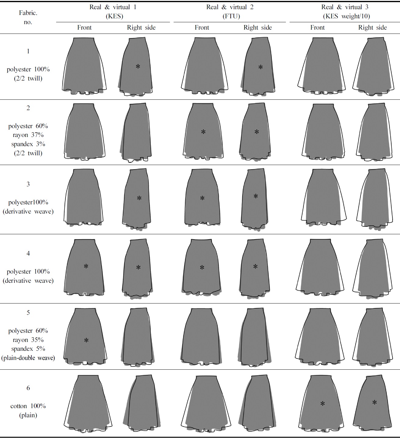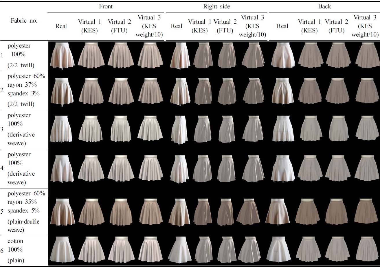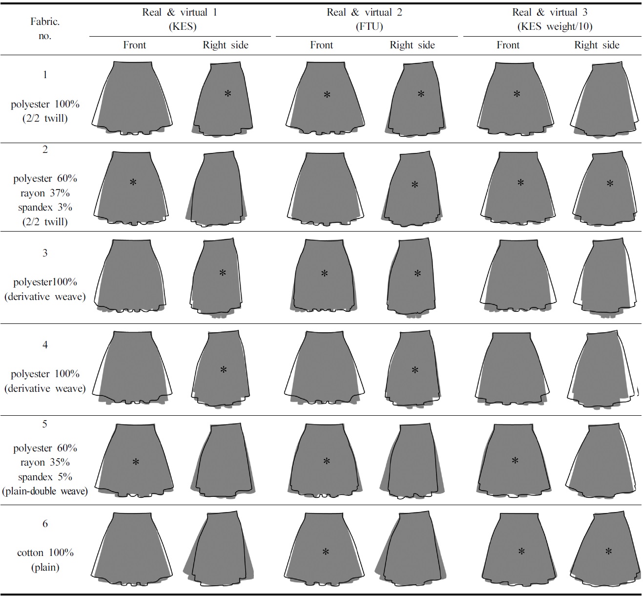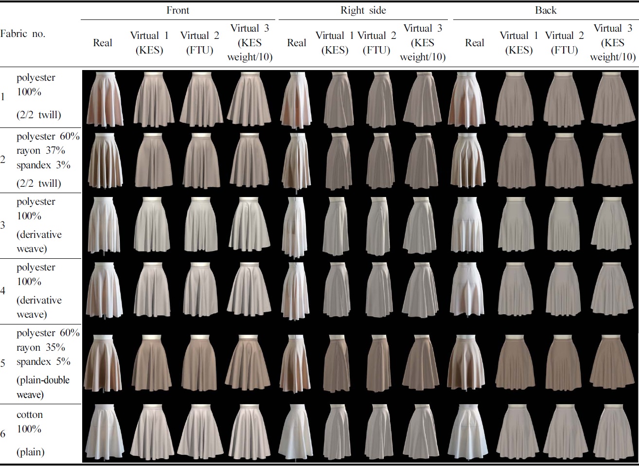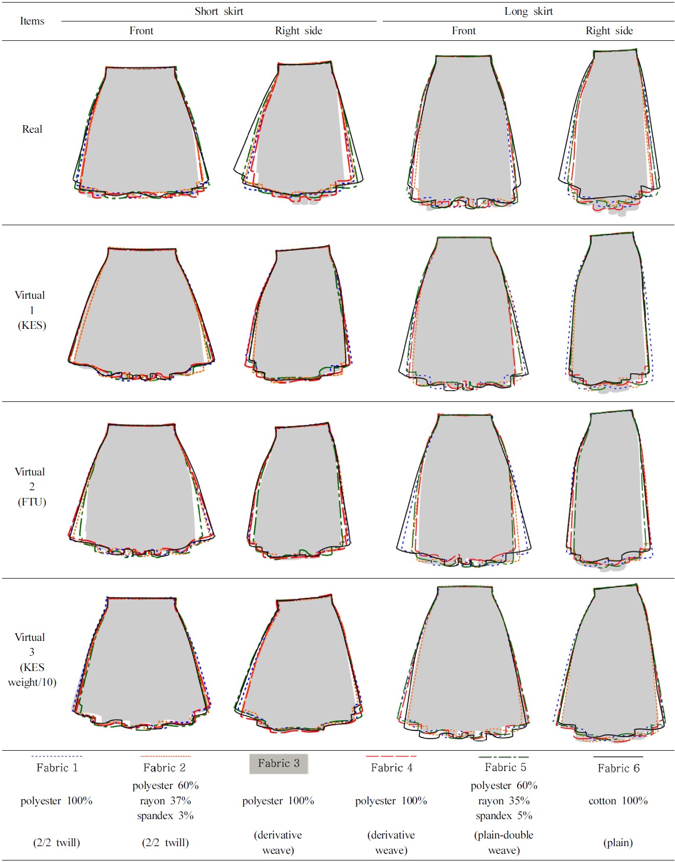 2. 실제와 가상 스커트 착장 이미지 비교결과, 가상1(KES)과 가상2(FTU)는 얇고 부드러우며 자중에 의한 변형이 심한 소재3을 유사하게 표현하였나, 나머지 소재에 있어서는 실제 스커트의 균일하고 부드러우며 자연스러운 형상의 플레어와 실루엣을 재현하지 못하였다. 전면 플레어는 수직방향으로 떨어지는 경향을 나타내었고, 특히 긴 스커트는 플레어 생성 위치가 중심부에 몰려 있었다. 또한 긴 스커트의 정면 실루엣은 옆선이 현저하게 굽거나 일직선으로 뻗치는 두 경우로 나뉘면서 자연스러운 실제 실루엣과 차이를 보였다. 반면 가상3(KES weight/10)은 전반적으로 자연스럽고 아름다우며 균일도가 매우 높은 플레어를 형성하였고, 볼륨감이 큰 소재6을 가장 유사하게 표현하였으나, 소재 간 차이를 거의 나타내지 못하였다.