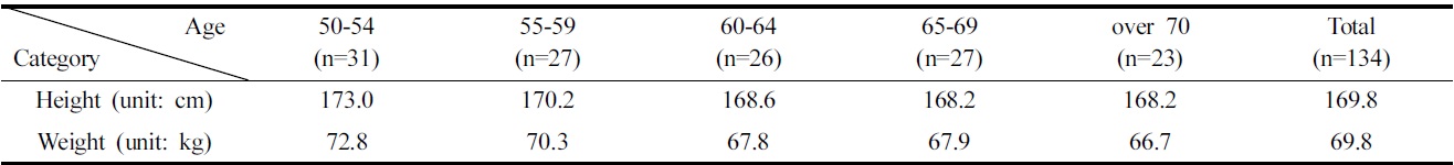 조사대상의 연령분포는 Fig. 1과 같다. 50대가 58명(43.3%)으로 가장 많았으며, 다음으로 60대 53명(39.5%), 70대 23명(17.2%) 순이었다. 각 연령별 전반기와 후반기로 나누어 살펴보면, 50~54세가 31명(23.1%), 55~59세가 27명(20.1%), 60~64세가 26명(19.4%), 65~69세가 27명(20.1%), 70세 이상이 23명(17.2%)이었다. 조사대상자의 키와 몸무게 응답결과를 살펴보면, 평균 키는 50~54세가 173cm, 55~59세가 170.2cm, 60~64세가 168.6cm이며, 65~69세와 70세 이상은 각각 168.2cm로 나타나, 연령이 증가할수록 평균 키가 작아지는 것을 알 수 있었다. 평균 몸무게는 50~54세가 72.8kg, 55~59세가 70.3kg, 60~64세가 67.8kg, 65~69세가 67.9kg, 70세 이상은 66.7kg으로, 키와 같이 평균 몸무게도 연령이 증가할수록 작아지는 것으로 나타났다(Table 1). 자신의 체형에 대해서는 71명(53.0%)이 보통체형으로 생각한다고 응답하였으며, 다음으로 건장한 체형이라고 생각하는 응답자가 40명(29.9%)으로 나타났다. 이는 아웃도어 활동을 즐기는 시니어 남성들은 마르거나 비만인 사람이 적고, 대부분 적절한 체형을 유지하고 있는 것으로 판단할 수 있다. 또한, 신체활동을 하는 노인들이 신체활동을 하지 않는 노인들에 비해 심리적으로 자기 자신에 대해 강한 자신감을 가진다는 연구 결과(Choi & Hyun, 2000)와 맥락을 같이 하는 것으로, 본 연구의 조사대상자 역시 자신의 체형에 대해 긍정적으로 생각하는 경향으로 보인다.