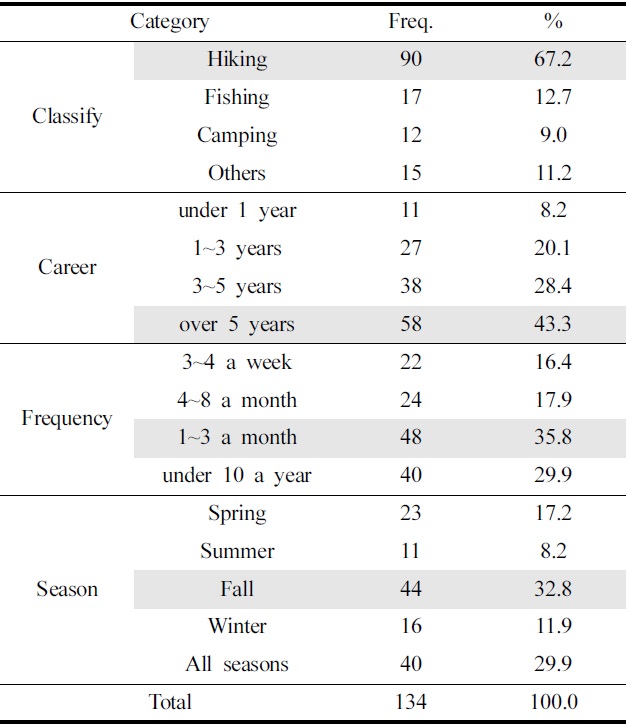 시니어 남성들이 즐겨하는 아웃도어 활동은 등산이 90명(67.2%)으로 가장 많았고 다음으로 낚시가 17명(12.7%), 캠핑이 12명(9.0%) 순이었다. 기타로는 자전거 타기, 골프 등이 있었다. 아웃도어 활동기간은 5년 이상이 58명(43.3%)으로 가장 많았으며, 다음으로 3~5년 미만이 38명(28.4%), 1~3년 미만이 27명(20.1%) 순으로 나타나 시니어 남성들이 아웃도어 활동을 꾸준히 지속하고 있는 것을 알 수 있었다. 아웃도어 활동의 빈도는 월 1~3회가 48명(35.8%)으로 가장 많았으며, 다음으로 연 10회 미만이 40명(29.9%), 월 4-8회가 24명(17.9%) 순이었다. 아웃도어 활동을 많이 하는 계절은 일 년 내내 즐긴다는 응답이 40명(29.9%)이었고, 이를 제외하면 가을 44명(32.8%), 봄 23명(17.2%), 겨울 16명(11.9%), 여름 11명(8.2%) 순으로 봄, 가을에 아웃도어 활동을 즐기는 사람이 50%에 달하였다(Table 2). 아웃도어 활동을 하는 방식은 개인으로 활동하는 응답자가 전체의 53명(39.6%)으로 가장 많았고, 몇몇 지인들과 함께 활동한다는 응답자가 52명(38.8%)으로 근소한 차이를 보였다. 반면, 동호회에 소속되어 있다거나 전문가 모임에 소속되어 있는 응답자는 상대적으로 낮은 비율을 차지하여, 시니어 남성들은 아웃도어 활동 시 단체 활동보다는 소수의 인원 중심의 활동을 선호하는 것을 알 수 있었다. Paek et al.(2013)의 연구결과 중50대 남성의 야외활동 특성과 비교하면 건강을 위해 월 1~2회 야외활동을 하고, 개인적으로 활동하는 비율이 높게 나타나 본 연구결과와 유사하였다.