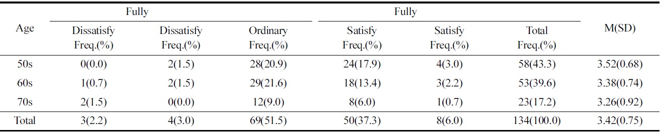시니어 남성들이 착용하고 있는 아웃도어 의류에 대한 만족도를 5점 평점척도로 평가한 결과 평균 3.42점으로 나타났다. 연령별로 만족도를 살펴보면 50대는 평균 3.52점, 60대는 평균 3.38점, 70대는 평균 3.26점으로 연령이 증가할수록 만족도가 낮아지는 것을 알 수 있었다(Table 3). 이는 대부분의 아웃도어 의류가 고가이며, 광고나 매장의 디스플레이 등에서 알 수 있듯이 주로 20~30대를 타깃으로 하고 있어 시니어에게 적합한 아웃도어 의류의 부재로 연령이 높을수록 아웃도어 의류에 대한 만족도가 낮아지는 것으로 판단된다. 현재 착용하는 아웃도어 의류에 불만족 한다고 한 응답자를 대상으로 불만족의 이유를 물어본 결과, 응답자 대부분 가격이 비싸기 때문이라고 응답하여 시니어 남성을 위한 아웃도어 의류 제작 시 합리적인 가격 설정이 필요하다고 생각된다. Paek et al.(2013)과 Lee(2010)의 연구에서도 연령과 성별에 관계없이 아웃도어 의류에 대한 가격불만이 월등히 높게 나타났다.
