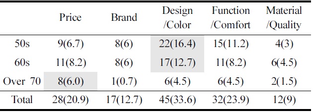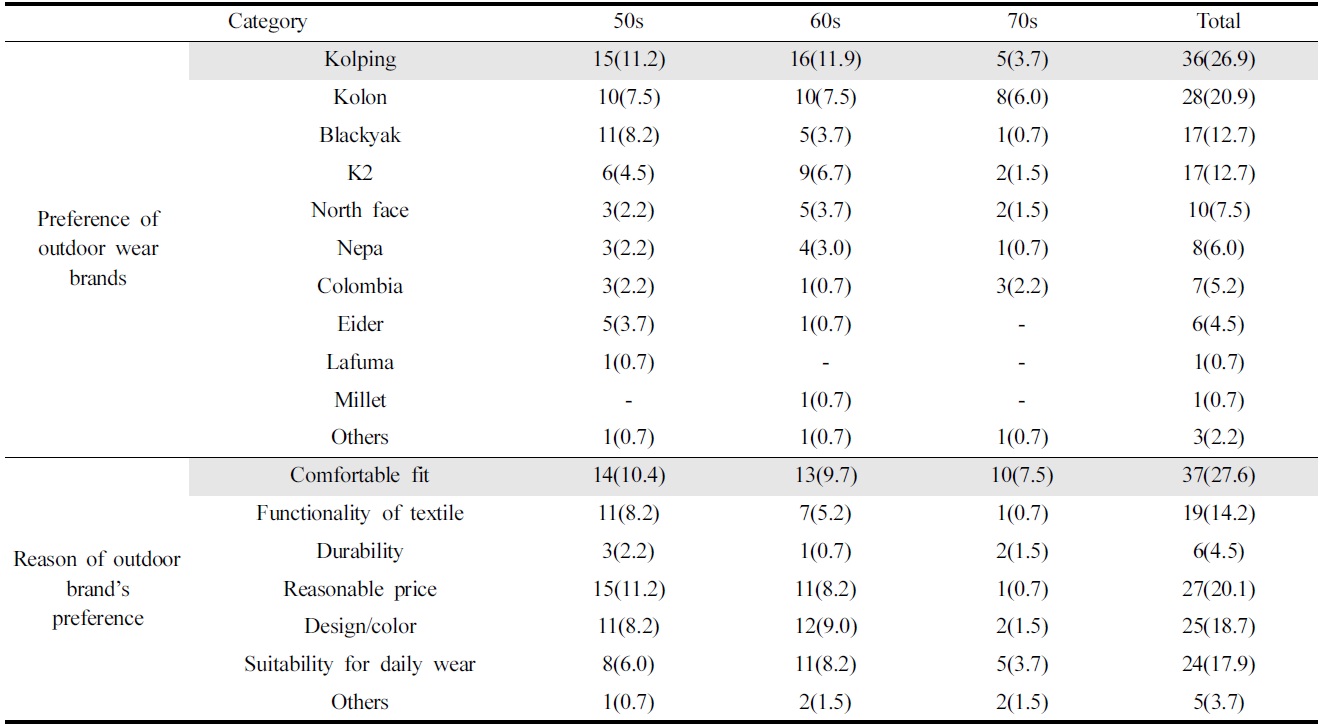 연간 아웃도어 의류 구매횟수는 1~2회가 91명(67.9%)으로 가장 높게 나타났고, 다음으로 3~4회가 29명(21.6%), 5~6회가 11명(8.2%) 순이었다. 아웃도어 의류 구매 시 가장 고려하는점으로는 디자인 및 색상이 45명(33.6%)으로 가장 높게 나타났으며, 다음으로 기능성 및 착용감이 32명(23.9%), 가격이 28명(20.9%) 순이었다. 이는 50대 시니어여성이 아웃도어 의류선택 시 디자인이나 심미적인 측면에 관심이 많다는 연구결과(Cho et al., 2014)와 유사하였다. 연령별로 구매 시 고려하는점을 살펴본 결과, 50대는 디자인 및 색상이 22명(16.4%)으로 가장 많았으며, 다음으로 기능성 및 착용감이 15명(11.2%) 순이었다. 60대는 50대와 마찬가지로 디자인 및 색상이 17명(12.7%)으로 가장 높은 비율이었고, 다음으로 가격과 기능성 및 착용감이 각각 11명(8.2%) 순이었다. 70대는 가격이 8명(6.0%), 다음으로 디자인 및 색상과 기능성 및 착용감이 각각 6명(4.5%) 순이었다(Table 4). 이로써 50~60대는 아웃도어 의류구매 시 심미적인 측면을, 70대는 가격을 가장 고려함으로써 연령에 따른 차이가 있음을 알 수 있었다.