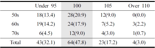 시니어 남성이 현재 착용 중인 아웃도어 재킷의 사이즈는 100호가 64명(47.8%)으로 가장 많았으며, 다음으로 95호 이하가 43명(32.1%), 105호가 23명(17.2%) 순이었다(Table 5). 이를 통해 다양한 브랜드의 제품 비교 시 100호를 기준으로 치수를 비교하고자 한다.