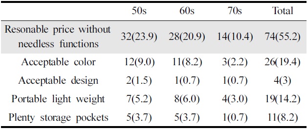 일상복으로 착용할 수 있는 아웃도어 의류에 대한 요구를 조사한 결과는 Table 7과 같다. ‘불필요한 기능성을 빼고 합리적인 가격이었으면 좋겠다’는 의견이 74명(55.2%)로 가장 높게 나타났으며, 다음으로 ‘무난한 색상이었으면 좋겠다’가 26명(19.4%), ‘휴대할 수 있을 만큼 가벼웠으면 좋겠다’가 19명(14.2%) 순이었다. 이는 현재 아웃도어 의류가 고기능성을 지향함과 동시에 가격 또한 매우 높게 책정되어 있는 현상(Chung et al., 2013)과 맥락을 같이 하며, 시니어 남성들을 위한 일상생활 겸용 아웃도어 의류는 불필요한 기능을 제거하여 합리적인 가격 설정이 매우 중요하다고 생각된다.