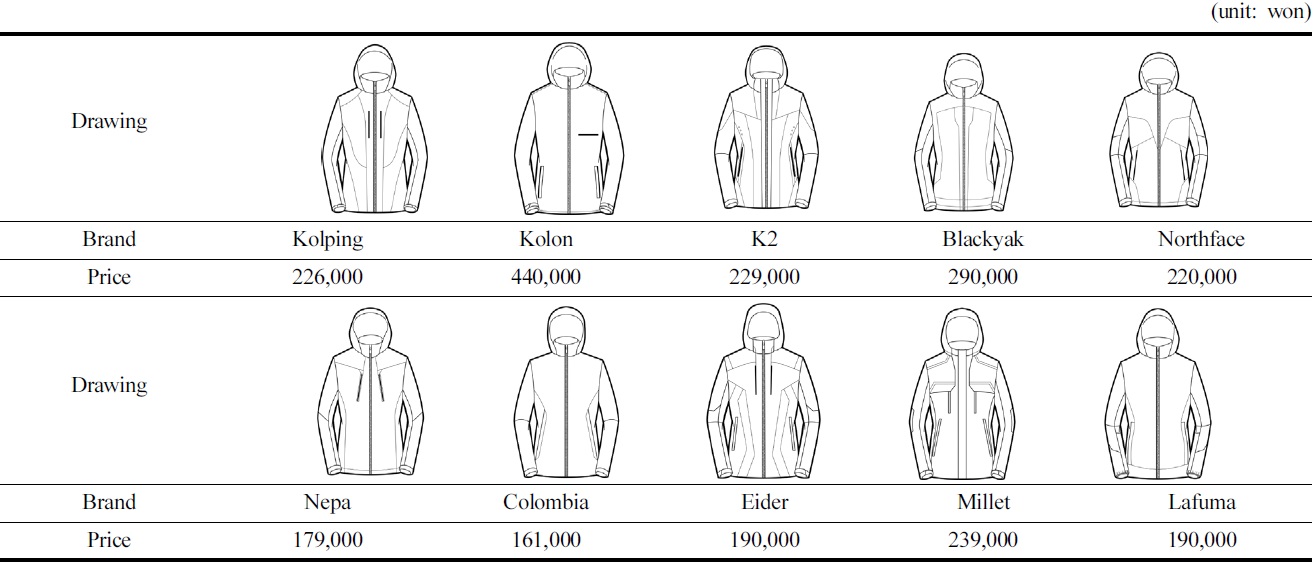 아웃도어 의류브랜드의 제품치수비교를 위해 유사한 실루엣을 가진 아웃도어 제품을 각 브랜드별로 1종씩 선택하였다. 브랜드별 기본형 바람막이재킷 스타일과 가격은 Table 8과 같으며, 소매형태는 소매의 직접적인 길이항목의 비교를 위해 셋인슬리브로 통일하였다. 각 브랜드별 기준스타일에 따른 실측치수는 Table 9와 같다. 재킷길이, 가슴둘레, 어깨너비, 소매길이, 손목둘레, 밑단둘레의 총 6항목을 조사하였는데, 노스페이스와 컬럼비아스포츠는 실측치수가 전혀 제시되어 있지 않았으며, 코오롱 스포츠는 95사이즈의 상세치수는 제시되어 있으나, 그 외 치수에 대해서는 제시되어 있지 않아 비교가 불가능하였다.