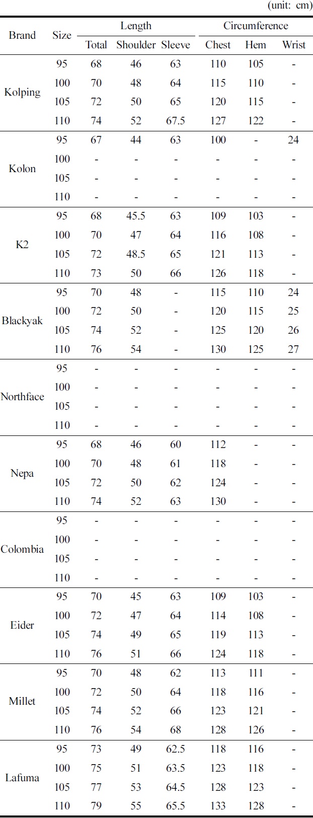 재킷길이는 치수100을 기준으로 라푸마가 75cm, 블랙야크와 아이더, 밀레가 각각 72cm이었다. 편차는 실측치수를 제시한 브랜드 중 K2를 제외한 모든 브랜드가 ±2cm이었다. K2는 90~105에서는 ±2cm의 편차이나 110에서 +1cm의 편차를 보였다. 가슴둘레는 라푸마가 123cm로 가장 컸고, 다음으로 네파와 밀레가 각각 118cm이었다. 대다수의 브랜드가 치수별로 ±5cm의 편차를 보였으나, 네파는 편차가 ±6cm이었다. 콜핑은 95~105치수에서는 ±5cm의 편차였으나, 110에서는 +7cm의 편차를 보였다. K2는 100~110에서 ±5cm의 편차였고, 95에서 –7cm의 편차가 있었다. 밑단둘레 역시 라푸마가 118cm로 가장 크게 나타났고, 다음으로 밀레가 116cm, 블랙야크가 115cm순이었다. 밑단둘레의 편차는 콜핑이 95~105 구간에서 ±5cm, 110사이즈에서 +7cm로 제시되어 있으며, 라푸마는 95에서는 –2cm의 편차를 보이고, 100~110은 +5cm의 편차를 보였다. 이외 브랜드들은 모든 치수구간에서 ±5cm의 편차를 보였다. 어깨너비는 라푸마가 51cm로 가장 크고, 블랙야크와 밀레가 각각 50cm로 나타났다. K2는 모든 치수에서 사이즈 편차가 ±1.5cm이었으며, K2를 제외한 모든 브랜드에서 어깨너비 편차는 ±2cm로 제시되어 있었다. 소매 길이는 콜핑, K2, 아이더, 밀레가 64cm로 가장 길었고, 다음으로 라푸마가 63.5cm, 네파가 61cm 순이었다. 치수편차는 K2, 네파, 아이더, 라푸마는 ±1cm를 보였고, 밀레는 ±2cm, 콜핑은 95~105에서 ±1cm, 110에서 +2.5cm로 각각 제시되어 있었다.