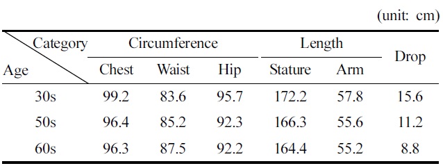 시니어를 위한 치수설정의 필요성을 알아보기 위해 연령에 따른 체형변화를 고찰하였다. 사이즈코리아에서 제공하는 제6차 인체치수조사 보고서를 바탕으로 청년층(30대)과 시니어(50대~60대) 남성의 가슴둘레, 허리둘레, 엉덩이둘레, 키, 팔길이를 비교한 결과는 Table 10과 같다. 가슴둘레를 살펴보면 30대에 비해 50대는 2.8cm, 60대는 2.9cm 작으나, 허리둘레는 50대는 1.6cm, 60대는 3.6cm나 컸으며, 엉덩이둘레는 50대는 3.4cm, 60대는 3.5cm 작았다. 이에 따라 남성체형분류 기준인 드롭(가슴둘레-허리둘레)은 30대는 15.6cm이나 50대는 11.2cm, 60대는 8.8cm로 크게 감소하였다. 길이항목에 있어서 키는 30대에 비해 50대는 5.9cm, 60대는 7.8cm 작았으며, 팔길이도 30대에 비해 50대는 2.4cm, 60대는 2.8cm 작았다.