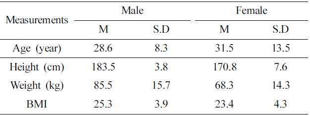 피험자 선정은 조건은 동작 분석 실험이 건강한 성인의 일반적인 걷기 동작 패턴 수집을 위한 것이므로 정형외과 병력이 없어야 한다는 것과 무거운 방화복과 방화 장비를 착용한 상태가 익숙하여 소방 구호 작업과 연계된 동작 패턴 수집이 가능하도록 하기 위하여 현직 소방관 경력자이어야 한다는 것이었다. 선정된 피험자는 미국의 북동부 지역에서 근무하는 남성 8명, 여성 4명으로 구성된 총 12명의 소방관으로 정형외과 병력이 없고 평균 6.6년의 소방 경력을 가지고 있다. 피험자들의 신체 조건에 대한 기술 통계는 Table 1과 같다.