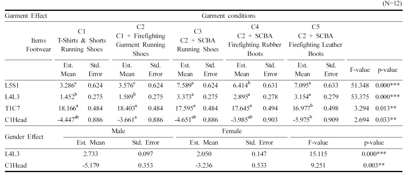 선 자세일 때 각각의 착용 상태에 따라 머리와 몸통 부위관절 각도의 평균을 비교, 분석한 것은 Table 2와 같다. L5S1(허리뼈 1/엉덩뼈 1)과 L4L3(허리뼈 4/허리뼈 3), T1C7(등뼈1/목뼈 7) C1Head(목뼈 1/머리)의 총 4개의 관절 부위에서 방화복과 방화 장비의 착용 상태에 따라 유의한 차이가 나타났다. 또한, L4L3과 C1Head의 관절 부위에서는 남성과 여성에 따라 유의한 차이가 나타나 성별 차이를 보였다.