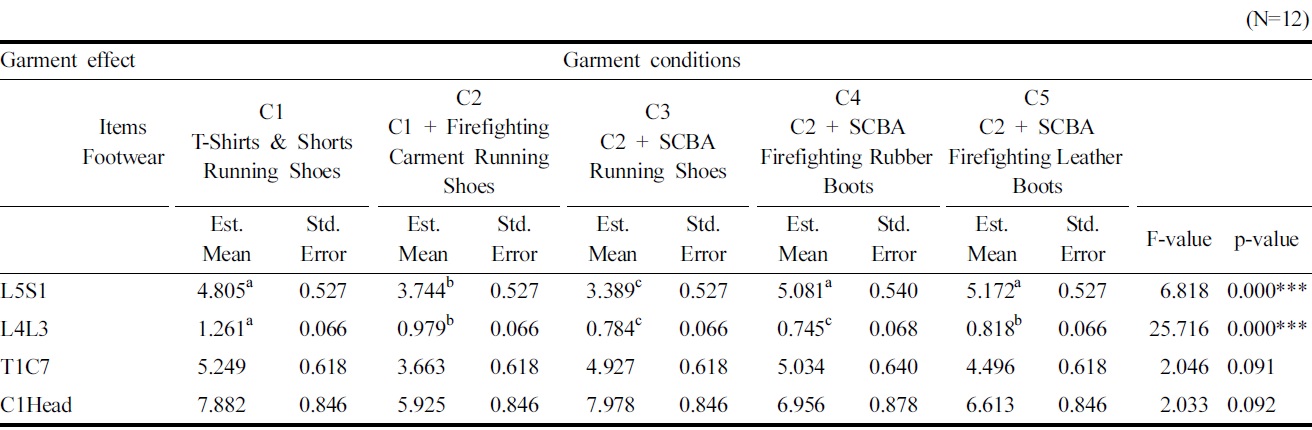 L5S1 ROM 사후 분석 결과, C1, C4, C5에서의 ROM이 각각 4.805°, 5.081°, 5.172°로 다른 착용 상태에 비하여 유의하게 큰 것으로 나타났다. 다음으로 C2의 ROM이 3.744°로 C3의 3.389°에 비하여 유의하게 큰 것으로 분류되었다. 선 자세에서 L5S1 관절 각도가 공기호흡기의 착용 여부에 따라 유의미하게 분류되었다면, 걷기 동작에서 ROM은 티셔츠와 반바지를 입고 운동화를 신은 C1와 방화복을 입고 공기호흡기를 착용하고 소방화를 신은 C4와 C5에서 유의미하게 크게 나타났다. C1에서의 ROM이 L5S1의 관절 각도가 적은 상태에서 자연스러운 걷기 동작의 바운스를 나타낸 것이라면 C4와 C5에서의 ROM은 L5S1의 관절 각도가 앞으로 크게 숙여진 상태에서 앞뒤로 큰 움직임을 보인 결과로 일의 양이 증가한 것을의미한다. 특히, 선 자세에서 가장 큰 관절 각도를 보이면서 걷는 동작에서 가장 적은 ROM을 보인 C3와 비교할 때 운동화에 비하여 중량과 구속력이 큰 소방화가 걷는데 필요한 에너지를 증가시켜서 ROM이 증가한 것으로 파악된다.
