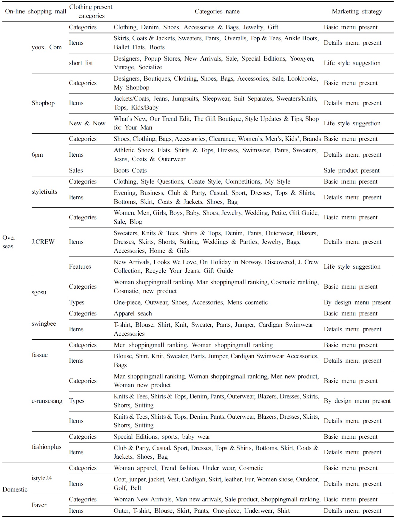 의류 카테고리 제공 방식을 살펴보기 위해 국내외 온라인 쇼핑몰 카테고리 제공 현황을 조사하여 요약하였다(Table 1). 온라인 쇼핑몰도 기본적으로는 오프라인 패션몰에서 사용하고 있는 아이템 별 카테고리를 그대로 활용하고 있는 것으로 나타났다. 여기에 추가적으로 마우스 오버(mouse-over) 기능을 활용하여 디자인 명칭 카테고리를 제공하고 있는 곳도 있었다. 의류 상품의 경우 브랜드의 중요성이 매우 높기 때문에 브랜드별 카테고리를 함께 제공하고 있었다. 또한, 라이프스타일이나 착용 상황에 맞춘 스타일 제안 카테고리나 주요 검색어로 많이 등장하는 의류 등의 인기 카테고리 등을 제공하는 것이 오프라인과의 차이점이었다(Lee, 2013).