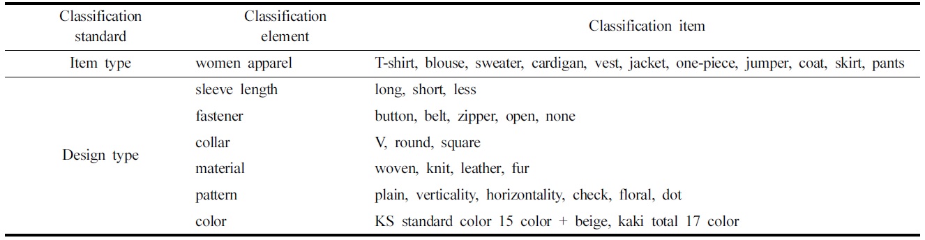 현재 기업에서 사용하고 있는 의류 분류 체계는 제품믹스의 넓이, 제품믹스의 길이, 제품믹스의 깊이 등 세가지 측면에서 분석이 이루어지고 있었다. 여성의류, 남성의류, 제화류로 구분하여 각각 아이템별 분류가 이루어지고 있었으며 여기에 디자인, 색상, 사이즈로 확대하여 상품을 재분류하고 있었다(Choi et al., 2011). 제품믹스의 넓이(width)는 기업이 취급하는 제품계열(product line)의 수를 말하며, 제품믹스의 길이(length)는 각 제품계열이 거느리고 있는 제품 군의 수, 그리고 제품믹스의 깊이(depth)는 특정 제품계열 내의 각 제품이 제공하는 아이템(item)의 수를 의미한다.
