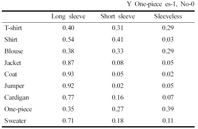 Table 3은 소매 길이와 의류 카테고리간의 평균 분석 결과이다. 티셔츠는 소매가 긴 경우 0.40, 소매가 짧은 경우 0.31, 소매가 없는 경우 0.29 순으로 선택되었다, 셔츠는 소매가 긴 경우 0.54, 짧은 경우 0.41 순으로 선택되었으며 소매가 없는 경우는 거의 선택되지 않았다. 블라우스는 소매가 긴 경우, 짧은 경우와 소매가 없는 경우가 거의 비슷한 비율로 선택되었다. 재킷의 경우 0.87, 코트 0.93, 점퍼 0.92로 소매가 긴 경우가 선택되어 높은 평균을 보였고, 가디건도 0.77로 비교적 높게 긴 소매가 선택되었다. 원피스는 다소 차이는 있으나 소매가 긴 경우, 짧은 경우, 없는 경우 등 세가지 경우가 비슷한 분포를 보였고, 스웨터류는 0.71로 긴소매가 많이 선택되었다. 이 같은 결과로 볼 때 티셔츠, 블라우스, 원피스는 주로 긴 소매, 짧은 소매, 소매가 없는 경우 순으로 이루어져 있는 품목임을 확인할 수 있었고, 셔츠는 긴 소매와 짧은 소매의 비율에 별 차이가 없었으며, 재킷, 코트, 점퍼의 경우 긴소매가 주를 이루고 있음을 알 수 있었다.