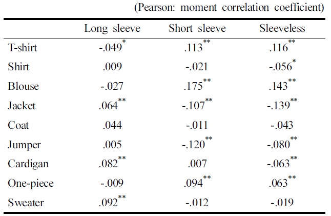통계적인 유의성 검증을 위해 Pearson 적률 상관 계수를 통한 상관 분석 결과를 살펴보면 Table 4와 같다. 평균 비교와 비슷한 결과로 티셔츠의 경우 긴 소매와는 5% 수준에서 부적상관을, 짧거나 없는 경우는 1% 수준에서 정적 상관을 보였다. 셔츠는 소매가 없는 경우에만 5% 수준에서 부적 상관의 결과를 보였고, 블라우스는 소매길이가 짧거나 없는 경우 1% 수준에서 유의한 정적 상관을 보였다. 재킷은 소매길이가 긴 경우 1% 수준에서 정적 상관을 보인 반면, 소매길이가 짧거나 없는 경우 부적 상관을 보여 재킷은 주로 긴 소매로 구성되어짐을 확인할 수 있었다. 또한, 재킷과 비슷하게 코트도 유사한 경향을 보였으나 유의한 수준은 아니었다. 가디건은 긴 소매와는 1% 수준에서 정적 상관을, 소매가 없는 경우는 1% 수준에서 부적 상관을 보여 가디건도 주로 긴 소매로 구성됨을 알 수 있었다. 원피스는 짧은 소매와 소매가 없는 경우 1% 수준의 유의한 정적 상관을 보여 원피스는 긴 소매보다는 짧은 소매나 소매가 없이 주로 구성됨을 알 수 있었다. 스웨터류는 긴 소매와 1% 수준에서 정적 상관을 나타내 스웨터류도 주로 긴소매로 많이 구성되고 있음을 확인할 수 있었다.