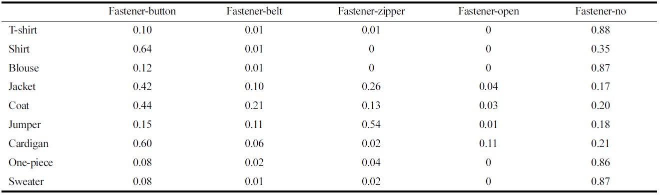 의류 카테고리와 잠금장치 간의 평균 분석 결과를 보면(Table 5), 티셔츠는 잠금장치가 없는 것이 가장 많이 선택되었고, 셔츠는 버튼(0.64)과 잠금장치가 없는 것(0.35) 순으로 선택되었으며, 블라우스는 잠금장치가 없는 것이 0.87로 평균점수가 높게 나타났다. 재킷은 다양한 분포를 보였는데 버튼 0.42, 지퍼 0.26, 잠금장치가 없는 것 0.18 순으로 선택되었고, 코트는 버튼 0.44, 벨트 0.21, 지퍼 0.13이 선택되었다. 점퍼는 지퍼가 0.54로 50% 이상 선택되었고, 가디건은 버튼이 0.60으로 60% 정도 선택되었다. 원피스와 스웨터류는 잠금장치가 없는 것이 각각 0.86, 0.87로 매우 높은 평균 점수를 나타내었다.