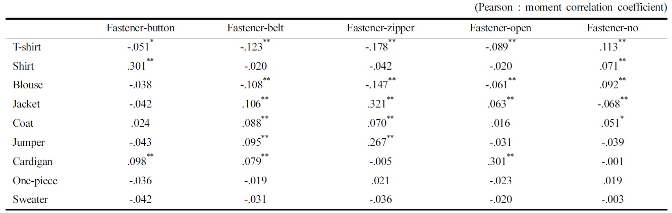 통계적인 유의성 검증을 위해 Pearson 적률 상관 계수를 통한 상관 분석 결과를 살펴보면(Table 6), 티셔츠는 잠금장치인 버튼, 벨트, 지퍼와는 1%와 5% 수준에서 부적 상관을 보이고 있었다. 잠금장치가 없는 오픈 디자인의 경우도 유의하게 부적상관을 보였으나 잠금장치가 없는 디자인의 경우 1% 수준에서 정적으로 유의하게 나타나 티셔츠는 주로 잠금장치가 없는 디자인으로 생산되고 있음을 확인할 수 있었다. 셔츠는 잠금장치 버튼의 경우 1% 수준에서 강한 정적 상관을 보여 주로 버튼으로 만들어져 생산되고 있는 반면, 잠금장치가 없는 경우도 상관계수는 낮지만 유의한 상관을 보여 잠금장치가 없는 셔츠 디자인에 대한 고려가 필요했다. 블라우스는 벨트, 지퍼, 오프 디자인에서 부적 상관을 보이고 잠금장치가 없는 경우 유의하게 정적으로 상관된 것으로 나타나 전반적으로 잠금장치 디자인이 별로 활용되지 않음을 알 수 있었다. 재킷은 벨트, 지퍼, 오픈 디자인에서 1% 수준의 유의한 상관을, 잠금장치가 없는 경우 부적 상관을 보여 벨트나 지퍼, 오픈 디자인이 많이 활용되는 잠금장치가 재킷의 중요한 디자인임을 확인할 수 있었다. 재킷과 유사한 코트의 경우도 벨트, 지퍼 디자인이 많이 활용되고 있었으나 재킷과 다른 점은 오픈 디자인도 통계적으로 유의한 결과를 보여 코트에서는 잠금장치가 없는 디자인도 많이 나타나고 있음을 알 수 있었다. 점퍼는 벨트와 지퍼만 1% 수준에서 유의한 정적 상관을 보여 벨트와 지퍼가 주로 잠금 디자인 요소로써 활용되고 있음을 확인할 수 있었다. 가디건은 버튼, 벨트, 오프 디자인이 정적으로 유의하게 나타났고, 원피스는 전체적으로 잠금장치와의 상관성이 유의한 결과를 나타내지 않아 뚜렷한 잠금장치에 대한 활용 선호도는 없는 것으로 판단되었다. 끝으로 스웨터류도 대부분 부적인 상관치를 나타내나 어떠한 잠금장치에도 유의한 상관 관계를 보이지 않아 잠금장치를 통한 확인은 어려웠다.