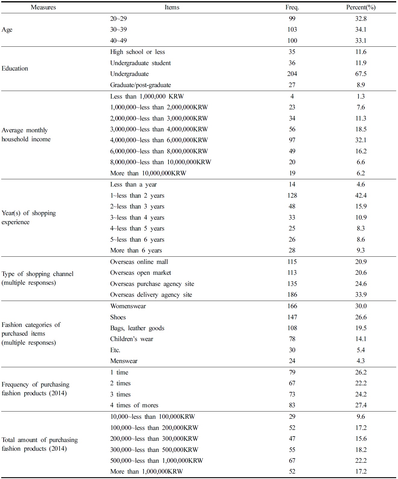 전국에 거주하는 만 20세 이상, 만 49세 이하의 여성을 대상으로 전문 리서치 기관의 패널모집을 통하여 2015년 3월20일부터 25일까지 온라인 설문이 시행되었다. 연구 목적에 부합하는 참여자를 선정하기 위해 설문을 시작할 때 응답자의 성별, 나이, 패션 제품의 온라인 해외직구 경험 여부를 물었으며, 회수된 응답 중 2014년부터 약 1년의 기간 동안 온라인 해외직구 채널을 통해 패션 제품을 구매한 경험이 있는 20대~40대 여성의 응답 총 302부가 최종 분석에 사용되었다. 자료분석은 SPSS 21.0프로그램을 이용하여 빈도분석, 신뢰도분석, 요인분석, 회귀분석을 실시하였다.