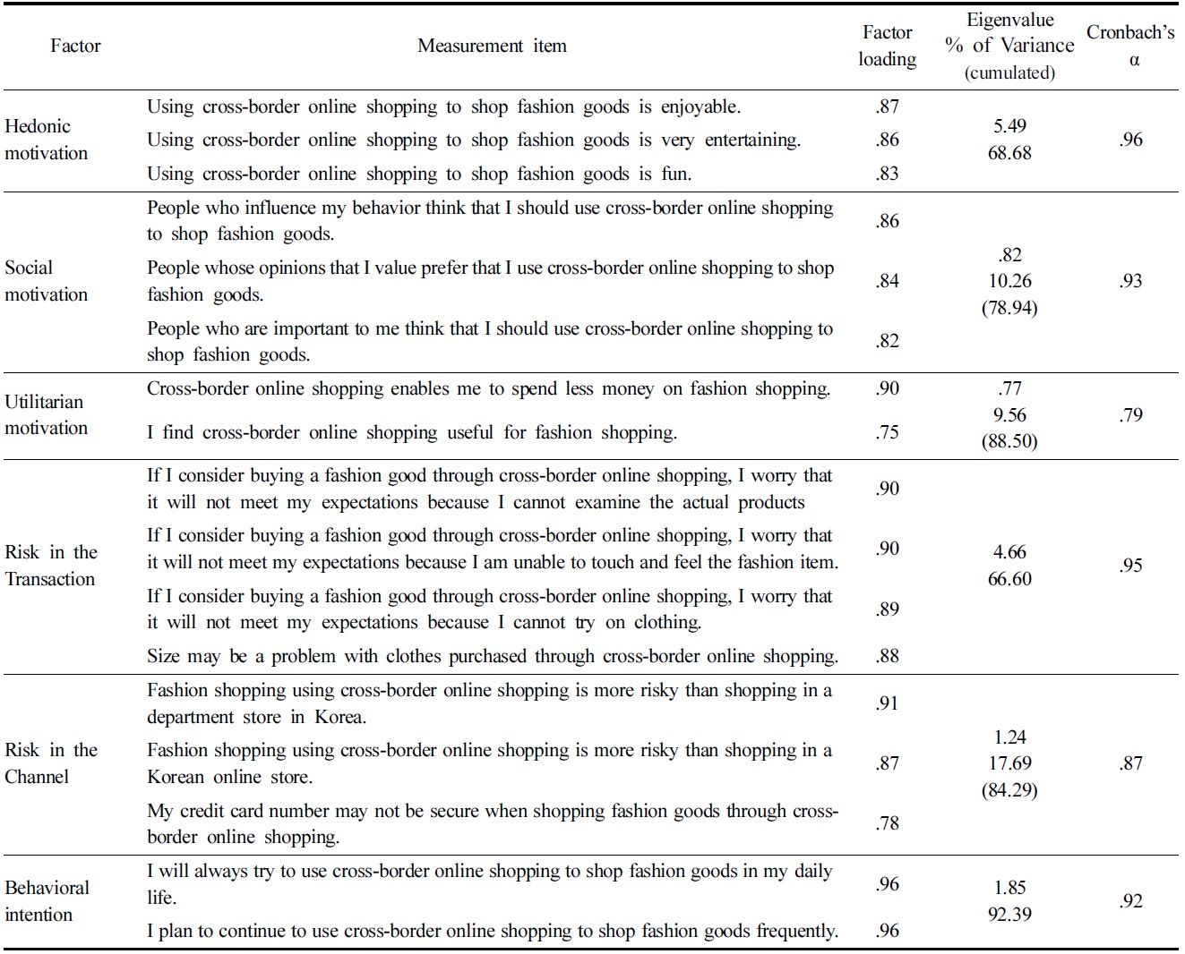 본 연구에서 효용적 동기는 Venkatesh et al.(2012)와 Yang(2010)의 연구 중 성과적 기대와 노력적 기대의 측정 항목들을 본 연구 목적에 합당하게 수정, 통합하여 총 2문항으로 구성하였다. Venkatesh et al.(2012)의 확장된 통합기술수용이론(UTAUT2)은 최종 소비자의 기술 또는 정보기술 채택 요인을 설명하는 모형으로, 온라인 해외직구가 몇 세기 전부터 행해졌던 크로스보더 쇼핑 소비 행동을 소비자가 1990년대부터 활용된 온라인 쇼핑이라는 기술에 융합, 채택하였다는 점에서 온라인 해외직구 동기를 밝히는 설문 문항으로 적정하다고 사료된다. 문항의 구체적인 내용은 ‘온라인 해외직구는 패션 제품 쇼핑에 유용하다’와 ‘온라인 해외직구는 패션 제품 쇼핑에 드는 비용을 절약해준다’이었다. 사회적 동기와 쾌락적 동기의 경우 Venkatesh et al.(2012)의 연구를 참고하여 각각 3문항으로 구성하였다. 위험 지각의 정도의 측정은 Gutiérrez et al.(2010)과 Liu and Forsythe(2010)의 연구의 채널 위험과 거래 위험 문항을 참조하여 총 7문항으로 구성하였다. 문항의 구체적인 내용은 ‘패션 제품 온라인 해외직구는 국내 백화점에서의 패션 제품 쇼핑보다 위험하다’, ‘패션 제품 온라인 해외직구는 국내 인터넷 쇼핑몰에서의 쇼핑보다 위험하다’, ‘패션 제품 쇼핑 중 온라인 해외직구 지불 과정에 입력하는 신용카드 정보가 유출되어 손해를 입을까봐 걱정된다’, ‘온라인 해외직구로 패션 제품을 구매하면 제품을 착용해 보고 살 수 없어서 불안한 생각이 든다’, ‘온라인 해외직구로 패션 제품을 구매하면 만지거나 느껴보고 살 수 없어 불안한 생각이 든다’, ‘온라인 해외직구로 패션 제품을 구매하면 사이즈나 크기가 맞지 않을까봐 걱정된다', ‘온라인 해외직구로 패션 제품을 구매하면 실제 제품을 미리 확인해볼 수 없어서 걱정된다’이다. 행동의도의 경우 Venkatesh et al.(2012)와 Zhou(2011)의 행동의도 개념을 참고하여 본 연구에 부합하게 수정한 총 2문항으로 질문하였다. 문항의 구체적인 내용은 ‘나는 향후 패션 제품 쇼핑을 위해 온라인 해외직구를 할 것이다’, ‘나는 향후 패션 제품 쇼핑을 위해 온라인 해외직구를 자주 할 생각이다’이었다.