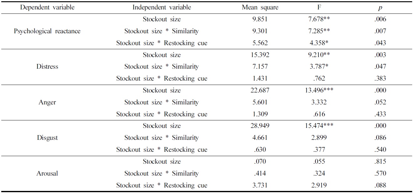 심리적 반발심과 감정에 미치는 품절크기의 주 효과를 확인하고, 구색 유사성 및 재입고 단서가 조절효과를 보이는지 살펴보고자 분산분석을 시행하였다.