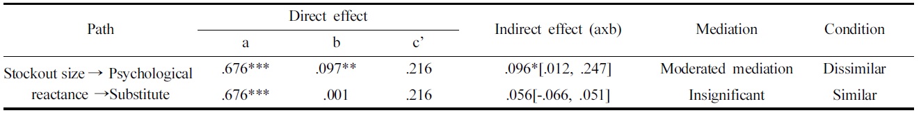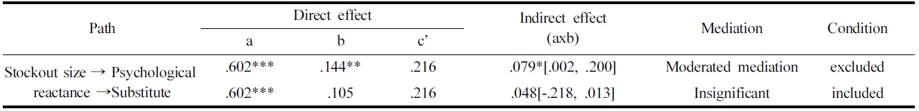 재입고 단서의 유무를 조절변수로 하는 심리적 반발심의 매개효과 분석결과는 Table 3과 같다. 전체 경로의 간접효과 중 CI 상한 값, 하한 값을 확인하였을 때 심리적 반발심은 대체행동에 대해서만 매개효과를 나타냈으며 구매연기, 점포이탈 행동에 대해서는 유의하지 않은 결과를 보였다. 대체행동에 대한 심리적 반발심의 매개효과는 재입고 단서의 조건에 따라 달라졌다. 즉 재입고 단서가 비제시인 조건에서만 품절크기가 심리적 반발심을 통해 상품대체행동에 정적영향을 미쳤다. 이는 재입고 단서가 없을 때, 심리적 반발심을 경험한 소비자는 상품대체행동이 증가되는 것으로 추론할 수 있다. 점포이탈행동에 대한 매개분석 결과 심리적 반발심의 매개효과는 규명되지 않았으나 품절크기가 점포이탈행동에 부적인 직접효과를 나타냄을 확인할 수 있는데(β=-.236), 이는 선행연구에서 품절이 소비자의 점포이탈 행동에 정적으로 영향을 미친다는 주장과 다른 결과이다. 이것에 대한 근거는 심리적 반발이론에서 찾을 수 있다. 심리적 반발심은 감정과는 다른 심리적 상태나 기질로써 부정적이며 불편한 감정(emotion), 기분(mood)과 정서(affect)와는 그 성질이 다르기 때문이다(Brehm, 1966). 따라서 이제껏 보고 되어온 부정적 감정과 다른 소비자 품절대응 행동의 경향을 나타낸 것으로 해석할 수 있다. 즉, 심리적 반발심으로 인해 제약받는 행동에 대해 보다 긍정적인 동기가 유발되어 상품대체 행동을 보이는 동시에, 떠나지 않으려는 심리상태에 따라 점포 이탈은 꺼린다는 것이다. 그러나 본 연구에서는 상품대체행동에 대한 간접경로만이 통계적으로 유의하였기에 결과를 일반적으로 적용하기에는 무리가 있다. 따라서 심리적 반발심만을 통해 품절 시 소비자의 행동반응을 모두 설명하기 어려우므로 후속연구를 통해 품절 시 소비자의 품절 대응행동에 미치는 심리적 반발심의 영향력을 확인하고 심리적 반발심과 소비자 행동 반응간의 매커니즘을 고찰해볼 필요가 있을 것이다.