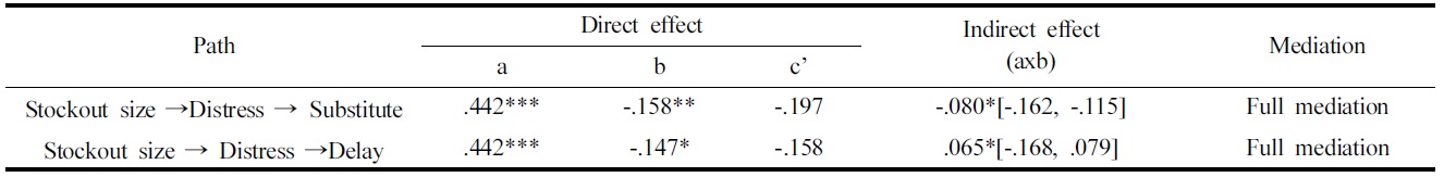 이러한 결과는 품절 시 소비자가 느끼는 감정에 있어 품절상황이나 점포에 대한 혐오보다는 사지 못한다는 분노와 아쉬움, 괴로움의 감정이 보고되었던 정성적 연구의 결과(Lee, 2012)와 일치하였다. 소비자 감정을 매개변수로 하는 각 경로의 직접효과, 간접효과의 검증결과는 다음 Table 4에 제시하였다.